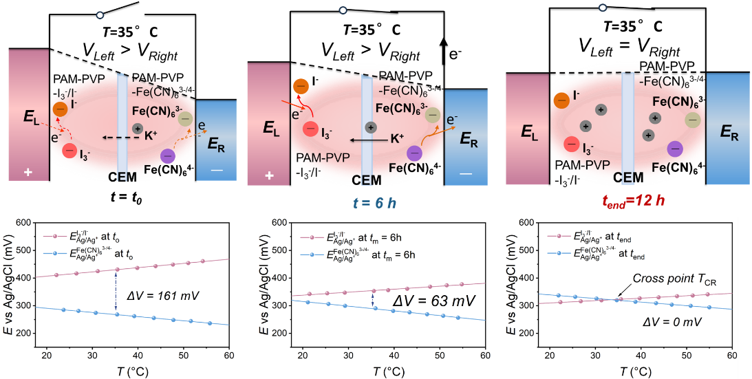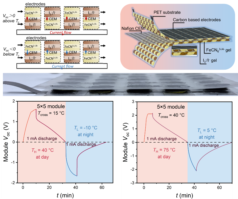 The team’s innovative t-ITC system overcomes the limitation of conventional thermoelectric devices that rely on fixed spatial temperature gradients by employing two gel electrolytes with opposite temperature coefficients, enabling efficient and continuous energy harvesting under cyclic temperature conditions. In addition, they proposed a temperature-adaptive self-regeneration (TASR) strategy that that allows the operation time-domain temperature range to adapt to changing environmental conditions (Figure 1).