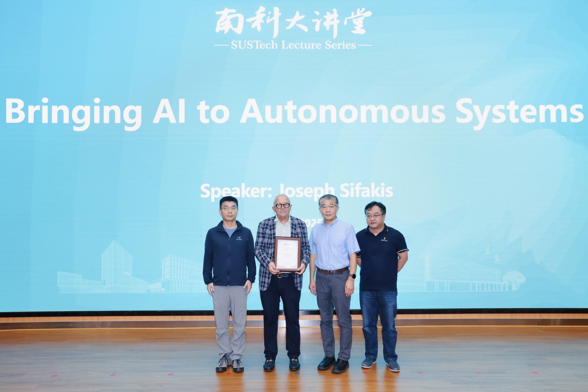 At the conclusion of the event, Mingwei CHEN, Dean of the College of Engineering; Qi HAO, Executive Director of RITAS; and Ke TANG, Head of the Department of Computer Science and Engineering, presented Joseph Sifakis with a commemorative certificate in recognition of his participation in the SUSTech Lecture Series.