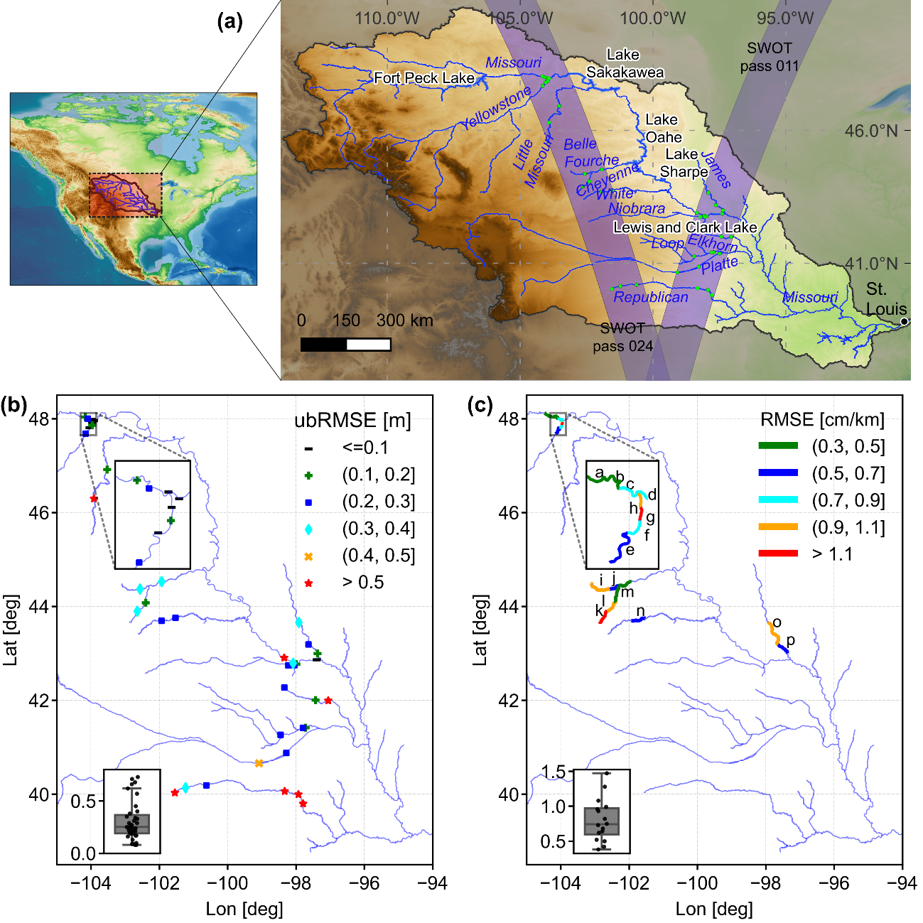 Figure 1. Geographic map of the Missouri River Basin and assessments of WSE and WSS. (a) The Missouri River network and major lakes along the main Missouri are shown. USGS stream gauges within SWOT coverage are indicated with green dots; the major lakes (reservoirs) are also labeled. Please refer to Table S1 in Supporting Information S1 for detailed information about gauges. (b) Assessment accuracy of SWOTWSE against USGS in situ data in terms of unbiased root‐mean‐squared error (ubRMSE) at 39 stations. Left‐corner box plot shows the dispersion of ubRMSE. (c) Assessment accuracy of SWOT WSS against USGS in situ data in terms of RMSE at 16 reaches.