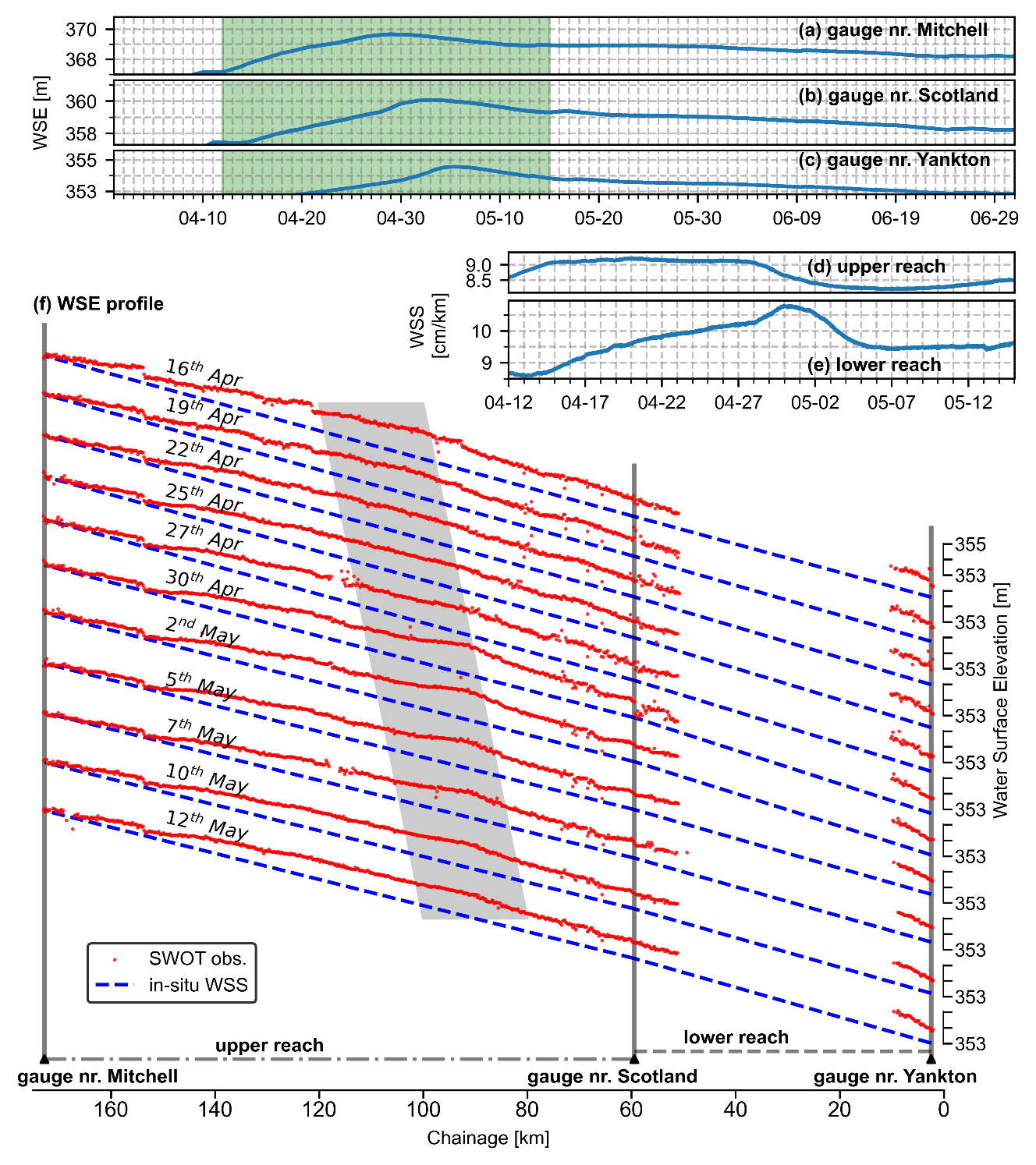 Figure 2. WSS of the James River tributary (reaches o and p as shown in Figure 1c) of the Missouri River. (a–c) Show the in situ water levels; (d–e) are the corresponding twin‐gauge slopes; (f) shows the instantaneous longitudinal profiles during the flood event. The gray area in (f) highlights the propagation of the flood peak captured by SWOT. Note that there are no data over the lower reach due to the SWOT nadir gap. The site IDs of the three gauges near Mitchell, Scotland, and Yankton are 06478000, 06478500, and 06478513, respectively.