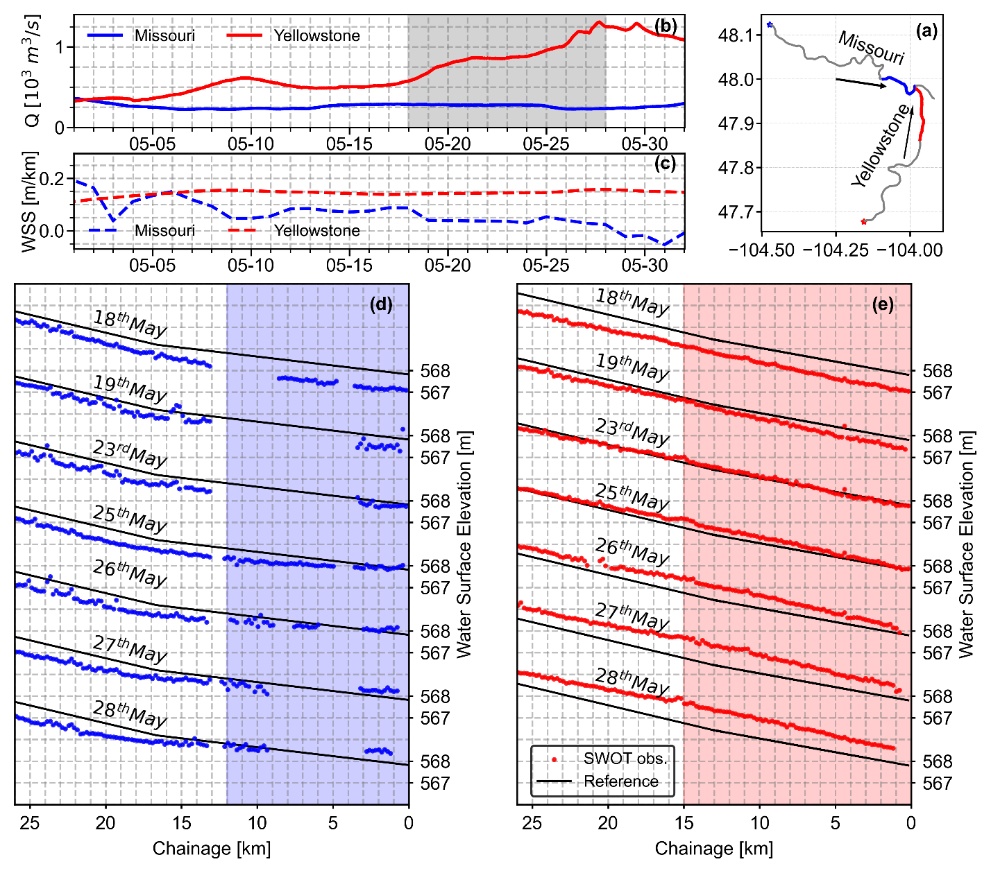 Figure 3. Backwater effects at the confluence of the Missouri and Yellowstone rivers. (a) Map of the river network, the two reaches used to investigate the backwater effects, and locations of gauges from which the discharge time series are shown in (b); (c) SWOT derived 3‐day moving average WSS of two reaches as highlighted in blue and red in (a), (d) and (e); (d) and (e) show the river long profiles on selected dates during the flood event of the Missouri and Yellowstone in May.