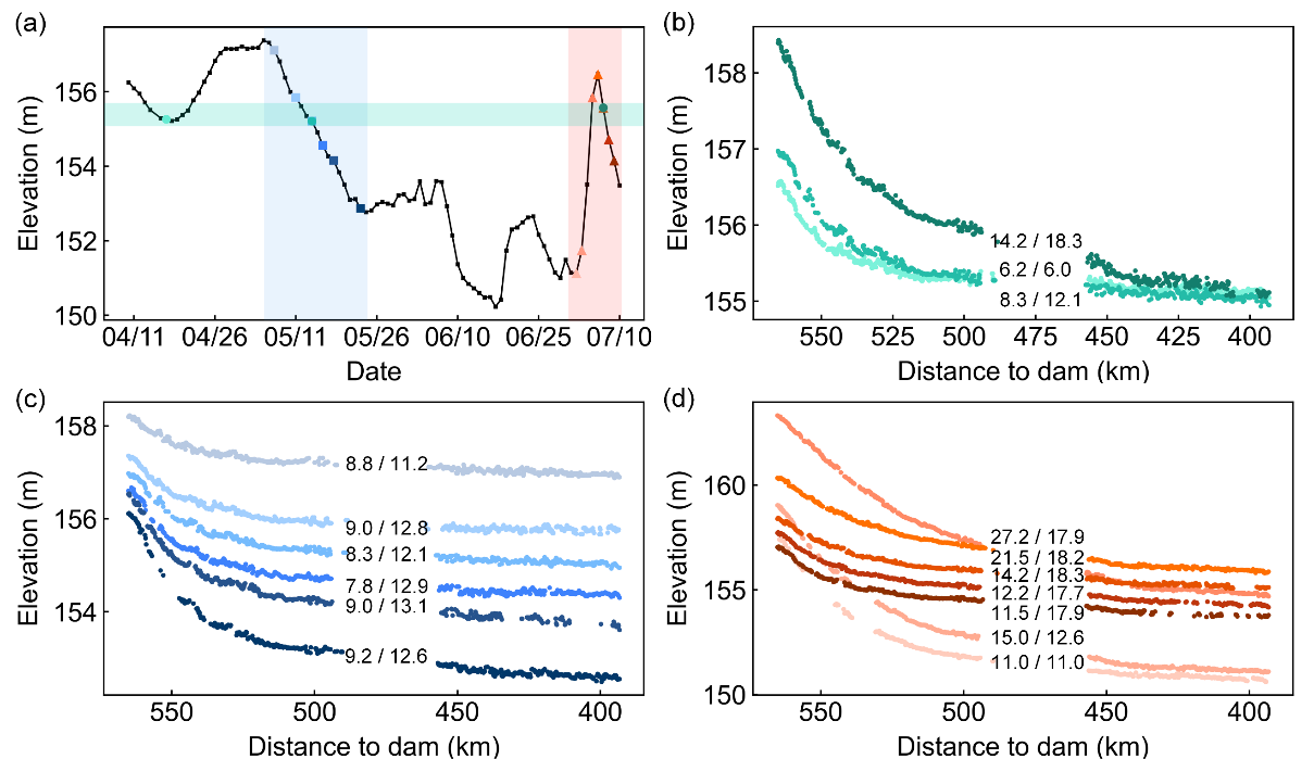 Figure 4. WSE profiles observed by SWOT and corresponding inflow and release (103 m3/s). (a) WSE time series at gauge 7. Shadings indicate three conditions of interest. (b) WSE profiles of three dates when similar WSEs occur at gauge 7. (c) Same as (b), but for a period of rapid water level decline. (d) Same as (b), but for a period of substantial WSE fluctuations. The numbers labeled indicate the inflow and release.