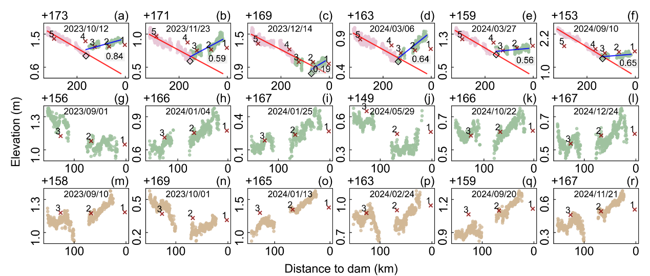 Figure 5. WSS and backwater effects. (a–r) WSE profiles are derived from the Raster product of SWOT 21‐day repeat cycles. Scatter point colors indicate different SWOT passes: pink for Pass 577, green for Pass 6, and yellow for Pass 271; Pass 577 and Pass 6 are approximately 10 hours apart. Red crosses show concurrent gauge observations. Diamonds mark the location of the lowest observed WSE in each profile. Red and blue lines represent separate linear regressions for the upstream and downstream segments, with the upstream regression line extended downstream. Assuming the upstream slope is consistent, the elevation difference between the two fitted lines at the location nearest the dam is annotated to highlight backwater‐induced changes.