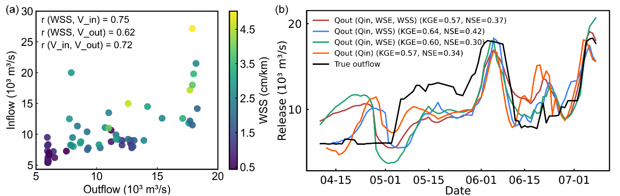 Figure 6. Relationships among WSS, inflow, and release. (a) Correlation between WSS, inflow, and outflow. The Pearson correlation coefficients are labeled in the upper‐left corner. (b) Release estimates based on Long Short‐Term Memory. Model performance of each scenario is indicated by Kling–Gupta Efficiency and Nash–Sutcliffe Efficiency.