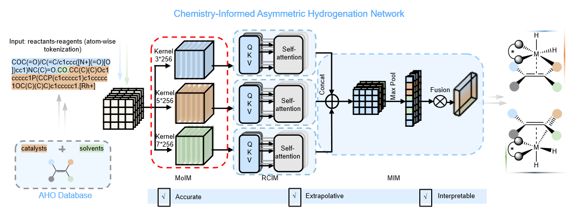 Inspired by these mechanistic insights, the team constructed a reaction-performance prediction model consisting of three innovative modules (Fig. 2). The Moiety Identification Module (MoIM) automatically recognizes structural moieties of different scales within each reactant and accurately captures key chemical fragments contributed by different reagents. The Reaction Components Integration Module (RCIM) integrates multi-scale moiety information from all reaction components to generate chemically meaningful molecular representations. The Molecular Interaction Module (MIM) further learns the cooperative interaction patterns among reaction components, enabling accurate identification of the true interaction mode between the olefin substrate and the metal catalytic center, thereby substantially improving the prediction of both stereoselectivity and absolute configuration. Built upon this architecture, the team developed ChemAHNet, the first model that simultaneously achieves descriptor-free learning, broad substrate applicability, absolute configuration prediction, and stereoselectivity prediction for asymmetric hydrogenation reactions.