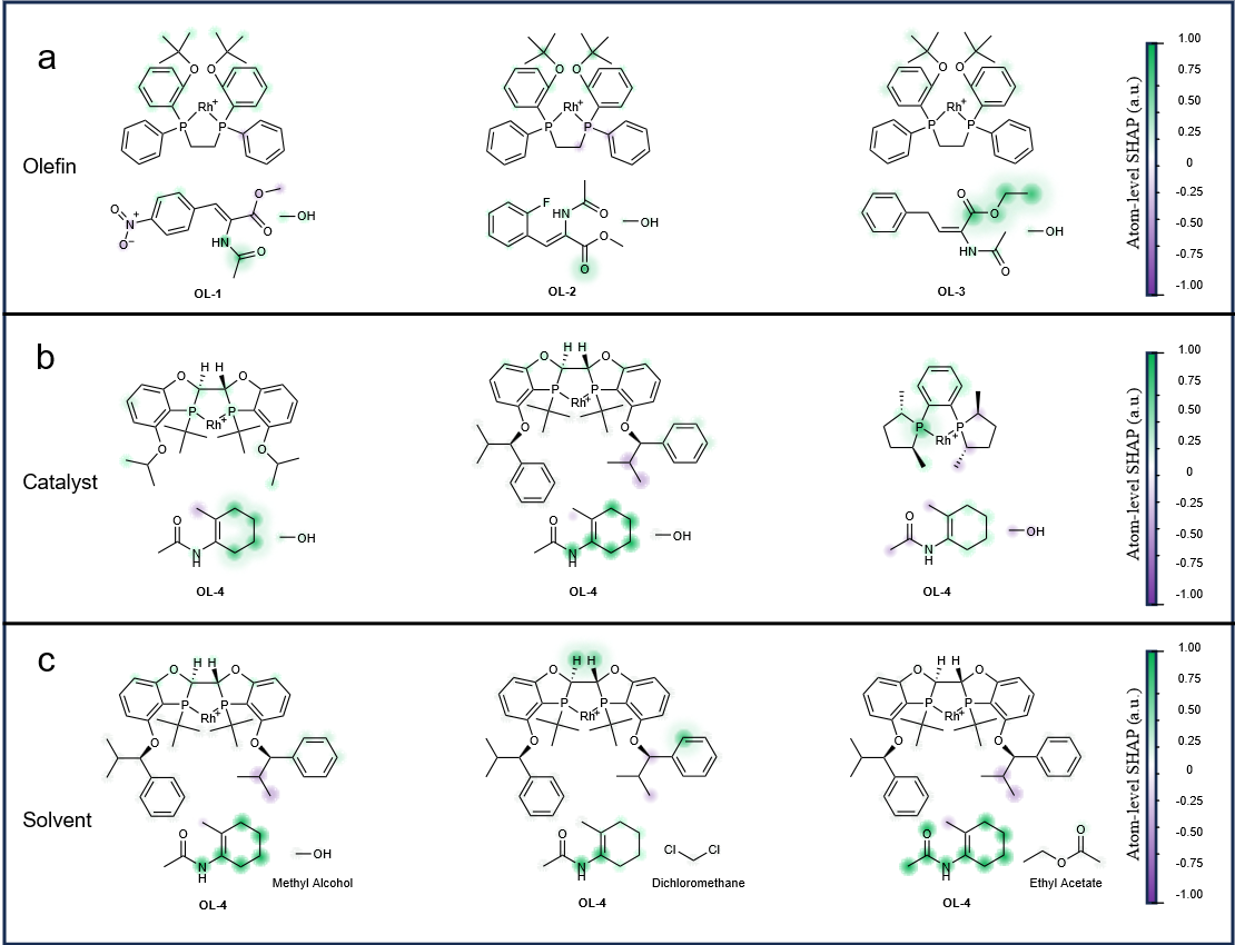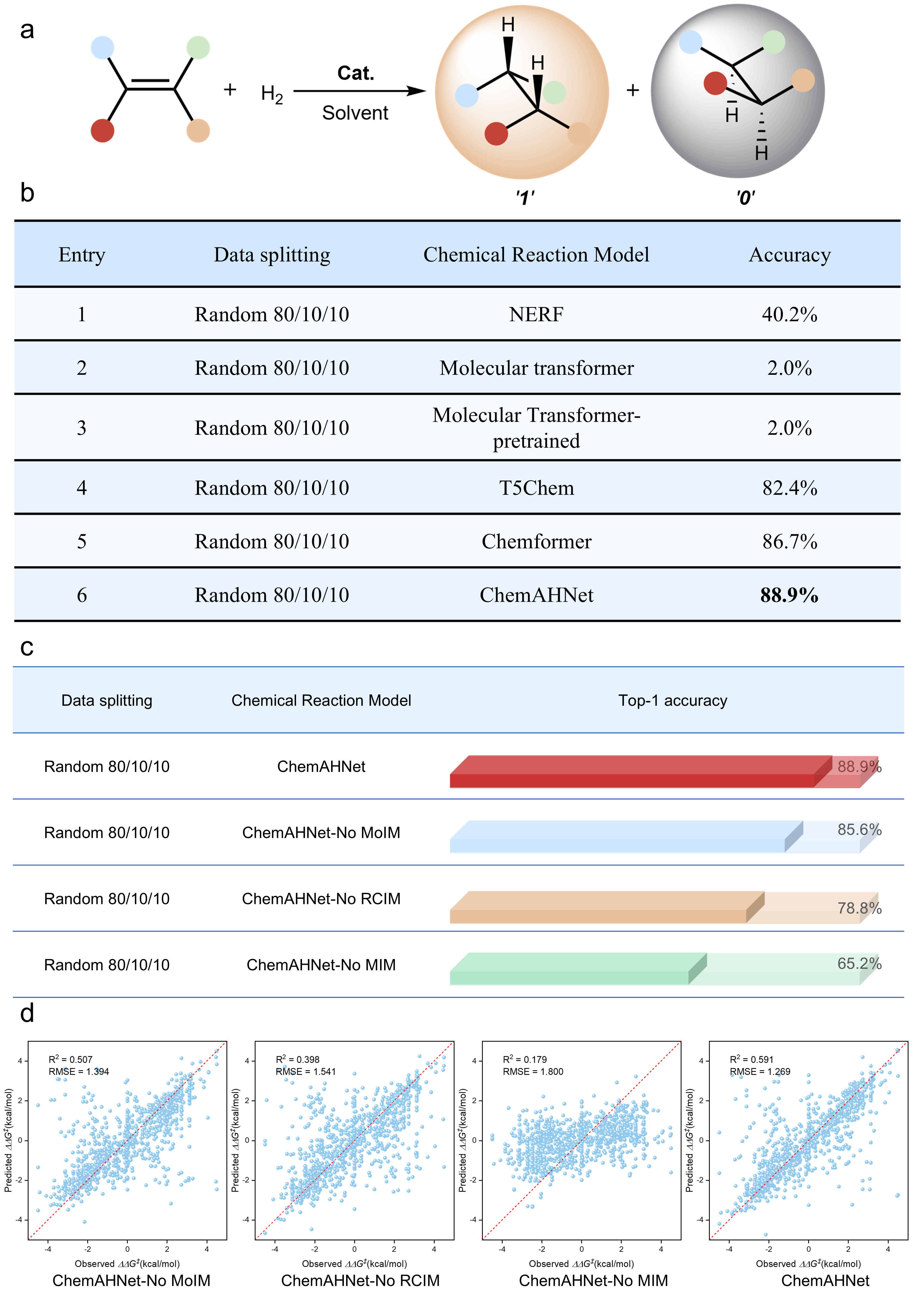 The results show that ChemAHNet achieves a top-1 accuracy of 88.9% in predicting the absolute configuration of the major product in olefin asymmetric hydrogenation, markedly outperforming all baseline models (Fig. 3b). This demonstrates that ChemAHNet can accurately capture the interaction mode between the substrate and the catalyst, thereby enabling effective prediction of the absolute configuration of the major enantiomer and significantly enhancing the model’s understanding of the stereocontrol principles governing olefin asymmetric hydrogenation.