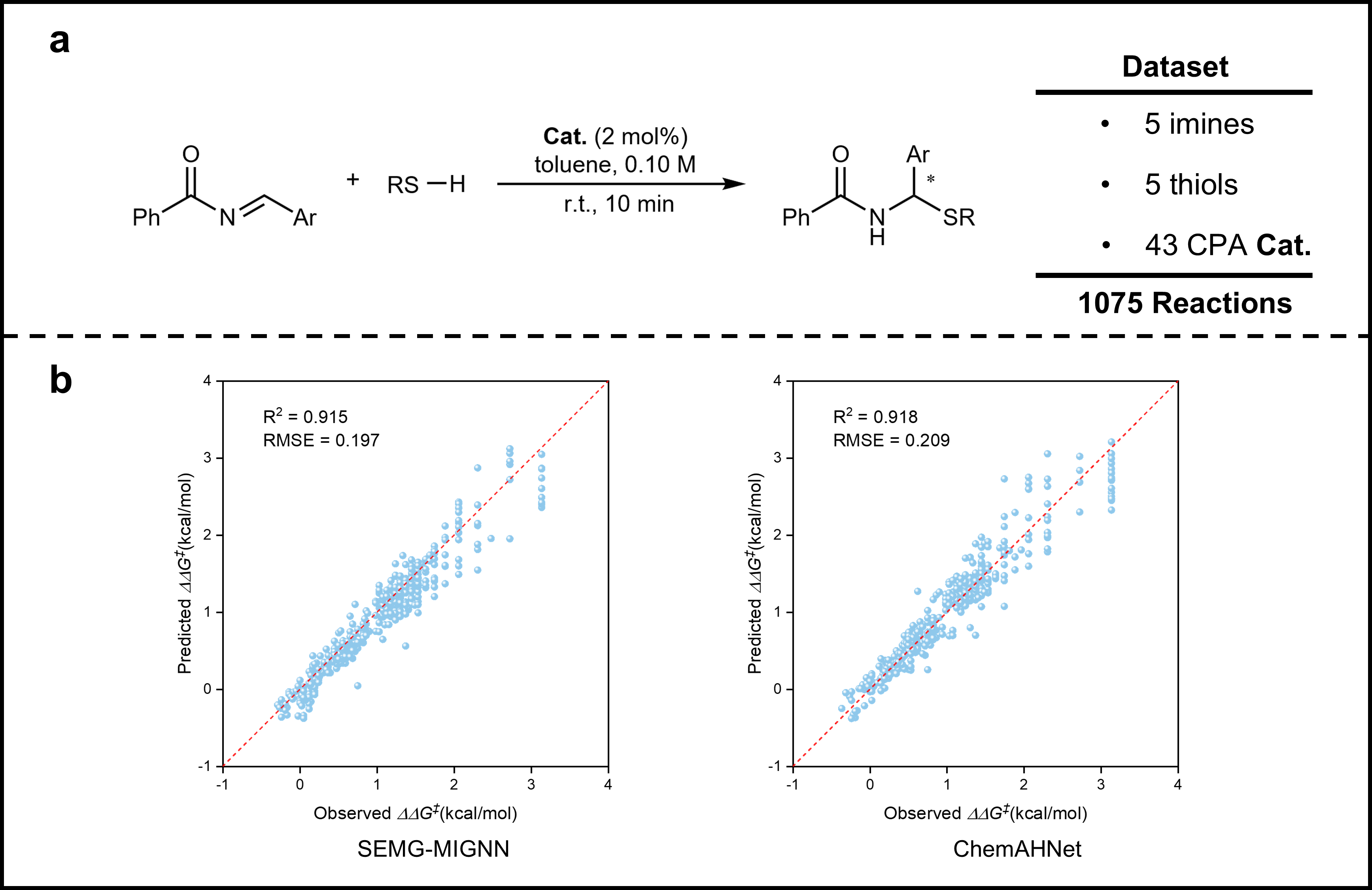To address the practical demands of asymmetric catalysis prediction, the team developed a novel stereochemical prediction model that learns directly from molecular structures. This model eliminates the reliance on predefined molecular descriptors and can autonomously extract key reaction features from raw molecular geometries and electronic structures. As a result, it accurately predicts the outcomes of asymmetric hydrogenation reactions across diverse substrate–catalyst combinations, including olefins bearing two prochiral centers. In addition to simultaneously delivering both stereoselectivity and the absolute configuration of the major product, the model exhibits outstanding generalization capability, making it applicable to a broad range of catalytic systems and substrate classes.