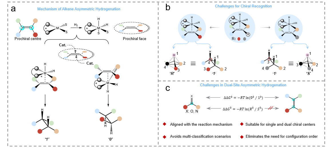 Recently, the team led by Associate Professor Bo ZHANG from the Department of Biomedical Engineering at Southern University of Science and Technology (SUSTech) published a research article titled “Chemistry-Informed Deep Learning Model for Predicting Stereoselectivity and Absolute Configuration in Asymmetric Hydrogenation” in Nature Computational Science. Building on the mechanistic understanding of olefin asymmetric hydrogenation, the researchers integrated chemical knowledge into a deep-learning framework and developed a predictive model termed the Chemistry-Informed Asymmetric Hydrogenation Network (ChemAHNet). For the first time, this model enables simultaneous and accurate prediction of both the absolute configuration and stereoselectivity in the asymmetric hydrogenation of olefins bearing dual prochiral centers, representing a significant milestone for the application of artificial intelligence in complex asymmetric catalysis.
