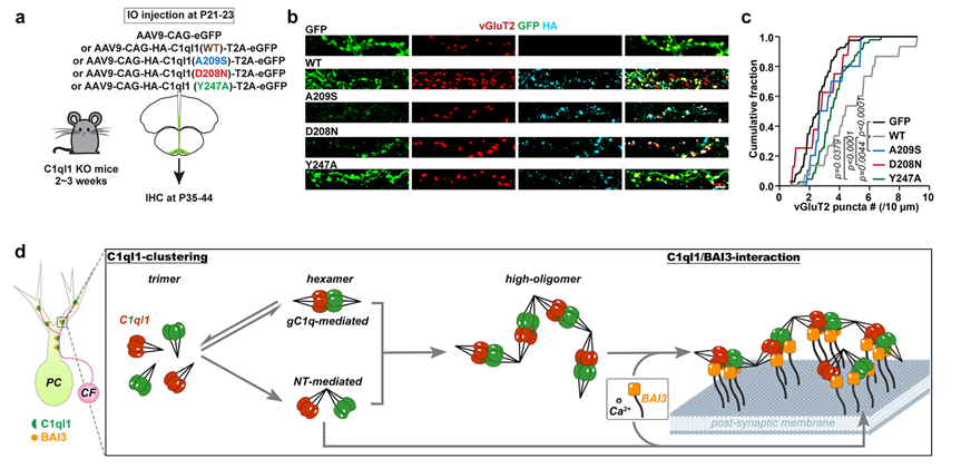 The researchers recombinantly expressed and purified the full-length C1ql1 protein, and negative stain electron microscopy (ns-EM) analysis revealed that, in addition to forming C-terminal gC1q hexamers, C1ql1 can also establish the N-terminal intermolecular linkages via two conserved cysteine residues. Both “tail-to-tail” and “head-to-head” oligomerization modes drive full-length C1ql1 to assemble into higher-order linear clusters, which serve as an “assembly platform” in the synaptic cleft. Importantly, this C1ql1 cluster platform significantly enhances the binding efficiency to postsynaptic BAI3 receptors, thereby promoting the development and maturation of CF-PC synapses (Figure 3).