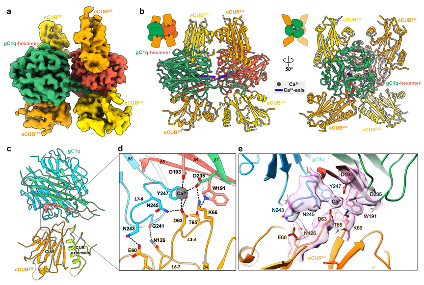 To dissect the C1ql1/BAI3 interaction mechanism, the researchers also determined the cryo-electron microscopy (cryo-EM) structure of the complex containing the extended CUB domain of BAI3 (BAI3-eCUB) and the C1ql1-gC1q hexamer using single-particle analysis. Notably, calcium ions also mediate the C1ql1-gC1q/BAI3-eCUB interaction by localizing at their interface to coordinate them together (Figure 2). By a combination of structural, biochemical, cellular experiments, and mouse experiments, the researchers verified that the trimer/hexamer transition of C1ql1-gC1q is essential for the assembly of synaptic adhesion complexes. Disruption of this transition leads to defects in CF-PC synapse development.