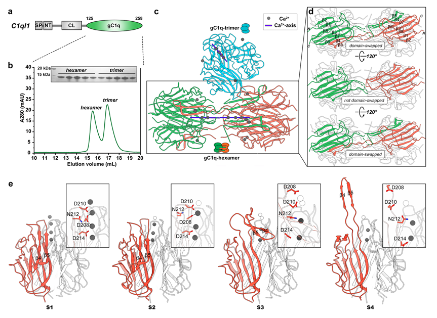The researchers first discovered that the gC1q domain of C1ql1 can assemble into a hexameric form, in addition to its well-characterized trimeric form. Crystallographic analysis of the C1ql1-gC1q hexamer revealed that this hexamer is formed by domain-swapping between two trimers. Combining with structural, biochemical, and molecular dynamics (MD) simulation analyses, the researchers further demonstrated that calcium ions, which localize at the central axis of the gC1q trimer, serve as a key regulatory switch that drives the trimer-hexamer transition of C1ql1-gC1q (Figure 1).