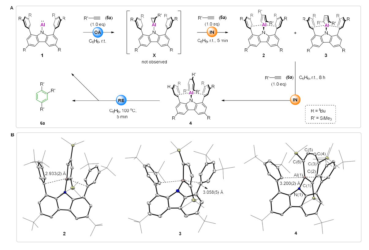 In 2021, the Liu Leo LIU group designed and isolated an aluminylene, an aluminum congener of carbenes (Figure 1D; the group’s first independent work at SUSTech, Angew. Chem. Int. Ed. 2021, 60, 27062). The team ingeniously exploited the unique “tri-active ambiphilicity” of this aluminyl species to couple oxidative addition and insertion reactions of alkynes. Simultaneously, the “conformational adaptability” of the nitrogen atom within the carbazolyl substituent was harnessed to facilitate key isomerization and reductive elimination steps. Together, these features enabled the construction of an Al(I)/Al(III)-based redox catalytic cycle, culminating in the successful realization of a Reppe-type alkyne cyclotrimerization reaction (Figures 1D and 2A).