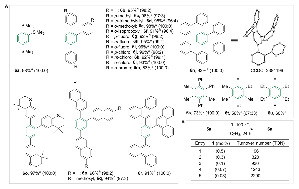 All three key intermediates in the catalytic cycle were unambiguously characterized by single-crystal X-ray diffraction (Figure 2B). Kinetic studies and theoretical calculations further support a complete Al(I) → Al(III) → Al(I) redox cycle. Notably, the catalytic system exhibits excellent functional group tolerance and outstanding chemoselectivity (Figure 3A), as well as remarkably high catalytic activity, with turnover numbers reaching up to 2290 (Figure 3B). Compared with previously reported non-precious-metal systems for alkyne cyclotrimerization, aluminum catalysis demonstrates significantly superior chemoselectivity relative to molybdenum-, iron-, and cobalt-based catalysts.