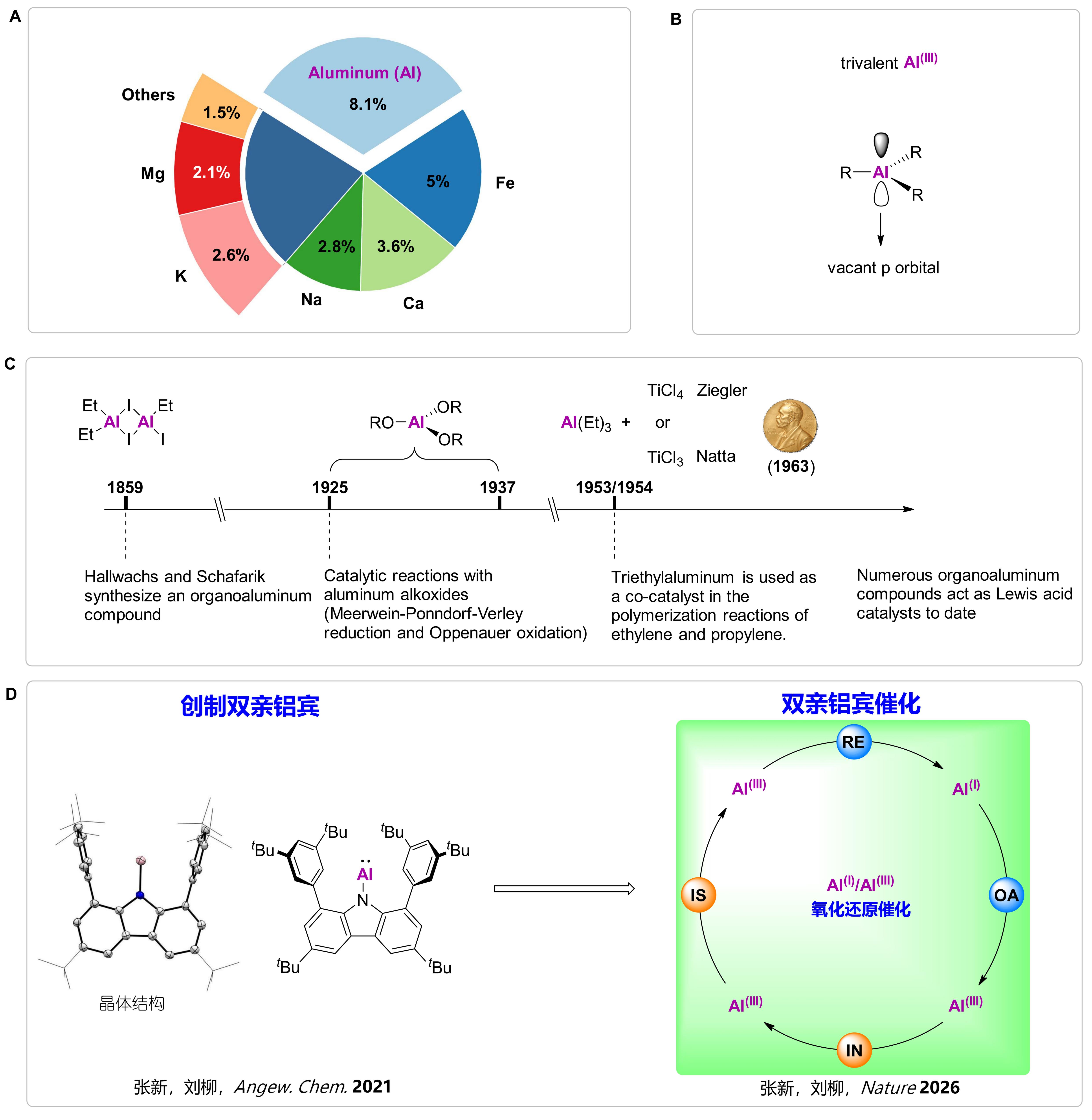 Aluminum is the most abundant metallic element in the Earth’s crust (8.1%; Figure 1A). In the periodic table, aluminum is not only the first metallic element in Group 13 but also the first metal in the p-block, with a valence electron configuration of 3s²3p¹. As a third-period element, aluminum is essentially unaffected by relativistic effects and possesses the lowest electronegativity among p-block elements (1.61). Governed by these intrinsic electronic features, aluminum strongly favors the loss of three valence electrons to form thermodynamically highly stable trivalent aluminum compounds (Figure 1B). In such Al(III) species, the aluminum center retains an empty 3p orbital, endowing them with pronounced Lewis acidity. Since the synthesis of the first organoaluminum compound in 1859, applications of aluminum compounds in catalysis over nearly 170 years have been largely confined to Al(III)-based Lewis acid catalysis (Figure 1C).
