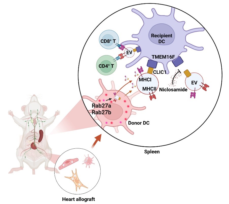 Allogeneic transplant rejection remains a leading cause of graft failure. Current immunosuppressive therapies, which lack antigen specificity, often result in significant side effects, including an increased risk of tumors and infections. To address this challenge, a deeper understanding of how transplant antigens are presented is critical for developing donor-specific immunosuppressive treatments. Transplant rejection is primarily initiated when the recipient’s immune system recognizes and responds to donor major histocompatibility complex (MHC) molecules. Traditional dogma suggests that donor DCs directly activate recipient T cells through MHC molecules, triggering an acute rejection response. However, Quan LIU challenged this theory, proposing instead that extracellular vesicles (EVs) from donor DCs, carrying MHC molecules, cross-decorate recipient DCs. This discovery introduces a novel semi-direct pathway for transplant antigen presentation driven by the “cross-decoration” of recipient DCs.