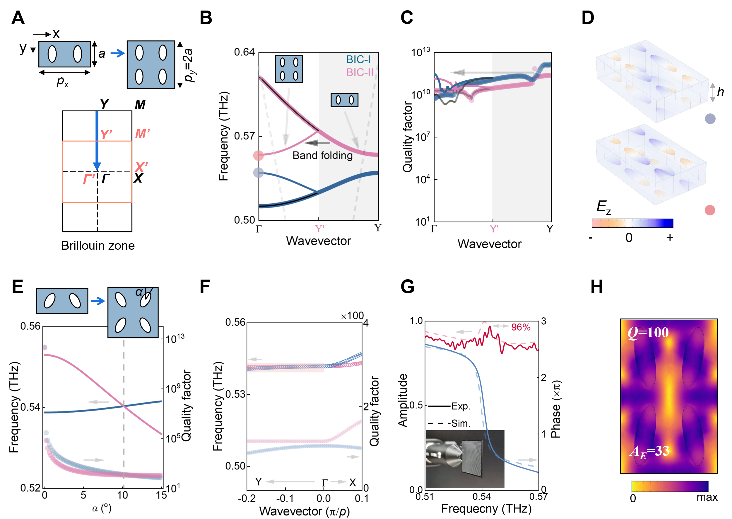 Within this new framework, we achieve, for the first time, broadband degeneracy of dual modes in momentum space—namely, the broadband Kerker effect. By folding the Y-point mode of a rectangular lattice to the Γ-point, we obtain band-folded BIC modes with both high robustness and high Q-factors (Fig. 2A–2D), maintaining stable degenerate characteristics across a broad wavevector range (Fig. 2B, 2F). Subsequently, by introducing slight structural asymmetry, we precisely control the far-field radiative leakage, enabling the two modes to achieve simultaneous crossing of both frequency and Q-factor at 0.542 THz (Fig. 2E, 2F). The resulting silicon-based membrane metasurface experimentally demonstrates transmission exceeding 96%, complete 2π phase coverage, and local field enhancement up to 33-fold, establishing the physical foundation for achieving broadband Kerker effect with high efficiency and high Q-factors (Fig. 2G, 2H).