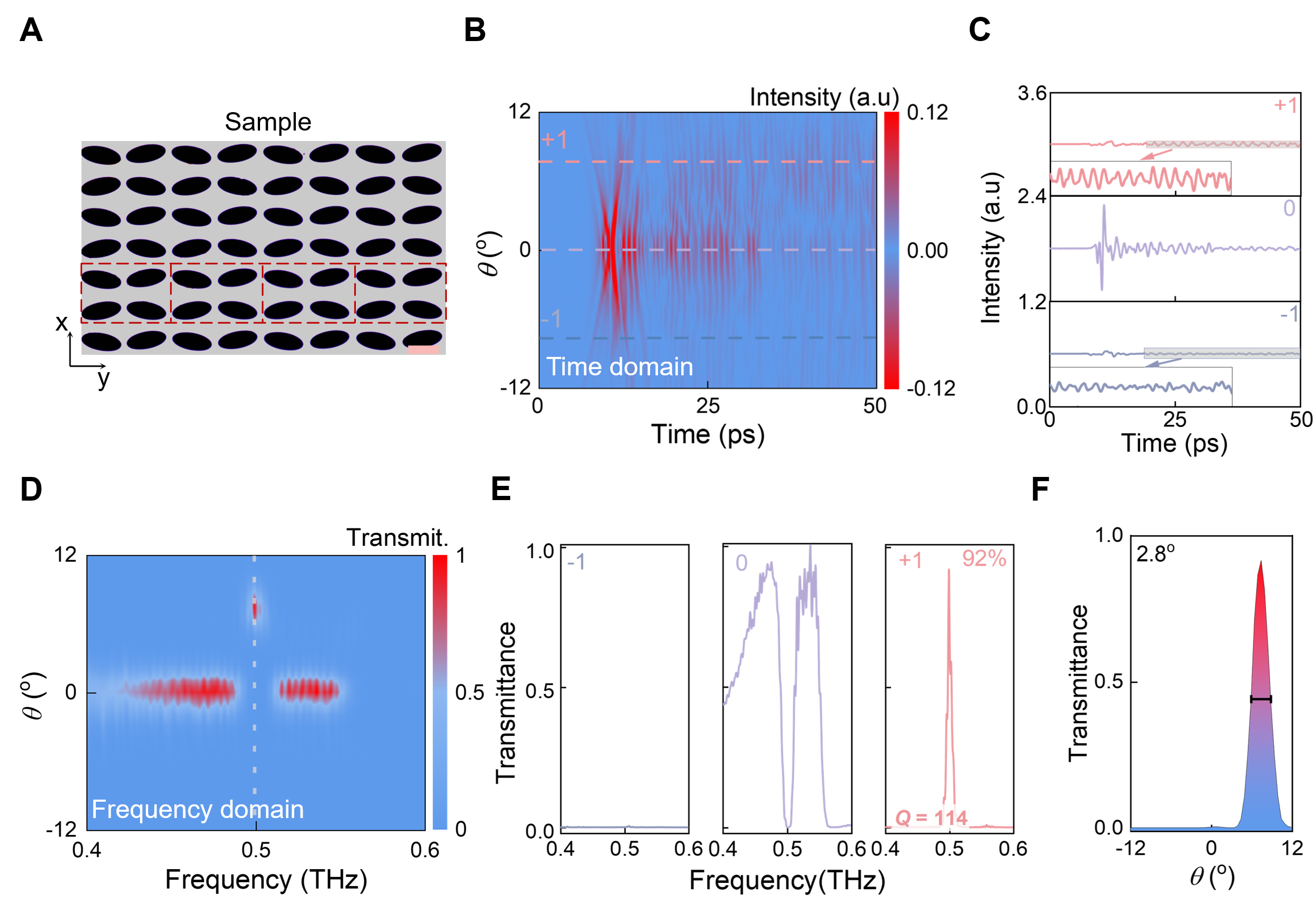 Building upon the meta-atom design with ultra-high transmission efficiency, we fabricated a phase-gradient metasurface requiring tuning of only a single parameter—the y-axis period—and experimentally achieved exceptional terahertz beam deflection performance (Fig. 3A). Angle-resolved time-domain spectroscopy measurements reveal that the device directs nearly all energy to the +1 diffraction order across the 0.4–0.6 THz band, with a deflection efficiency as high as 92%, while completely suppressing the 0th order diffraction (Fig. 3B-3E). Benefiting from the narrowband resonance enabled by q-BIC, the deflected beam exhibits an ultra-small divergence angle of merely 2.8° and a Q-factor up to 114, delivering exceptional spectral and spatial selectivity (Fig. 3F). The integration of ultra-high efficiency, free-standing membrane architecture, and narrowband high-Q control within a single device is unprecedented in the field of terahertz beam manipulation, providing a powerful platform for next-generation high-performance, low-power photonic devices.