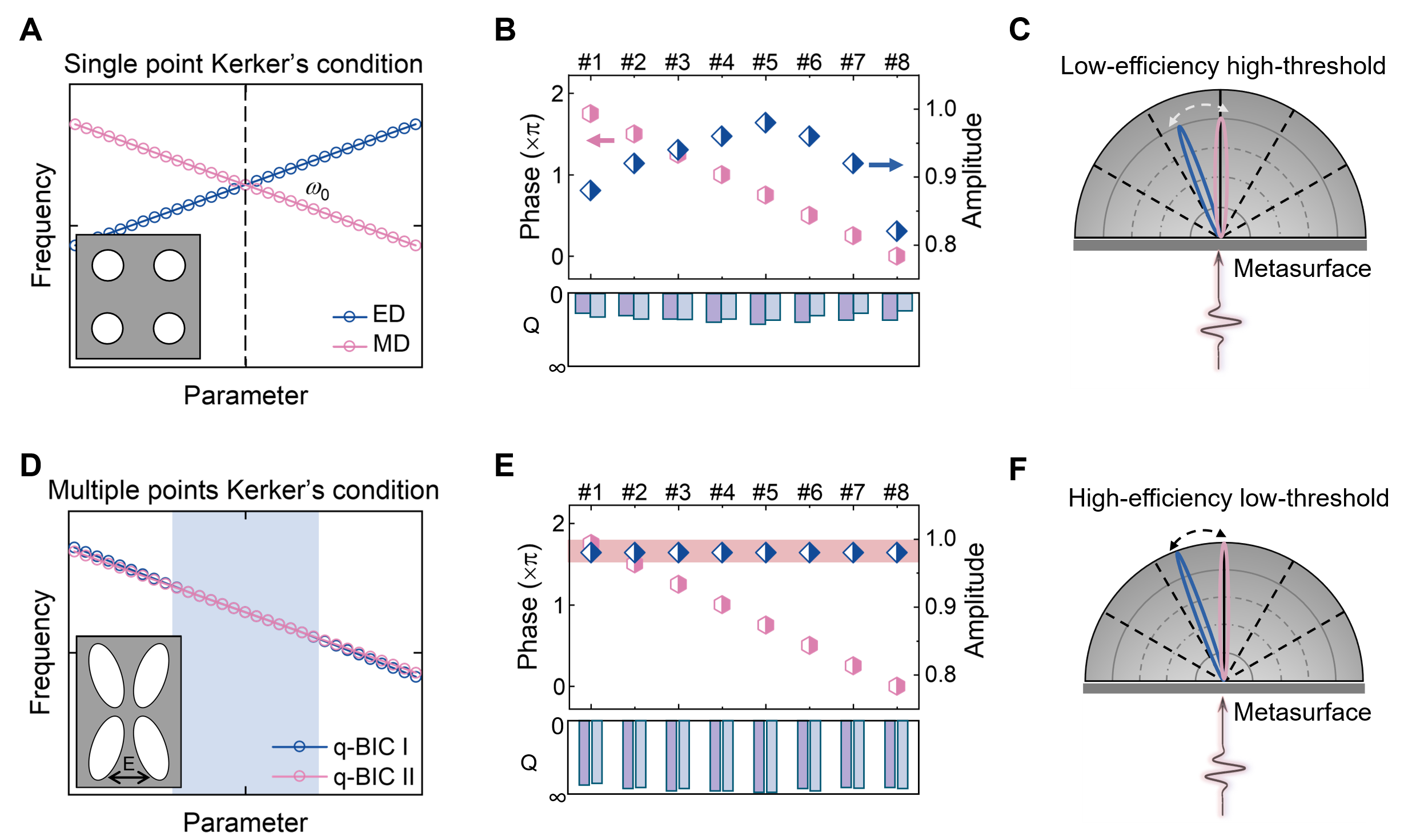 More importantly, this design overcomes the fundamental bottleneck of conventional single-point Kerker effect, which struggles to maintain high efficiency across the complete 2π phase modulation range (Fig. 1A-1C), achieving near-100% optical field transmission efficiency for all structural elements throughout the full phase coverage (Fig. 1D-1F). By engineering the q-BIC dispersion mechanism and deeply coupling it with the extended broadband Kerker effect, the team has constructed a novel membrane metasurface optical field manipulation architecture that simultaneously features high efficiency, high spatial and spectral selectivity, and low-threshold modulation.
