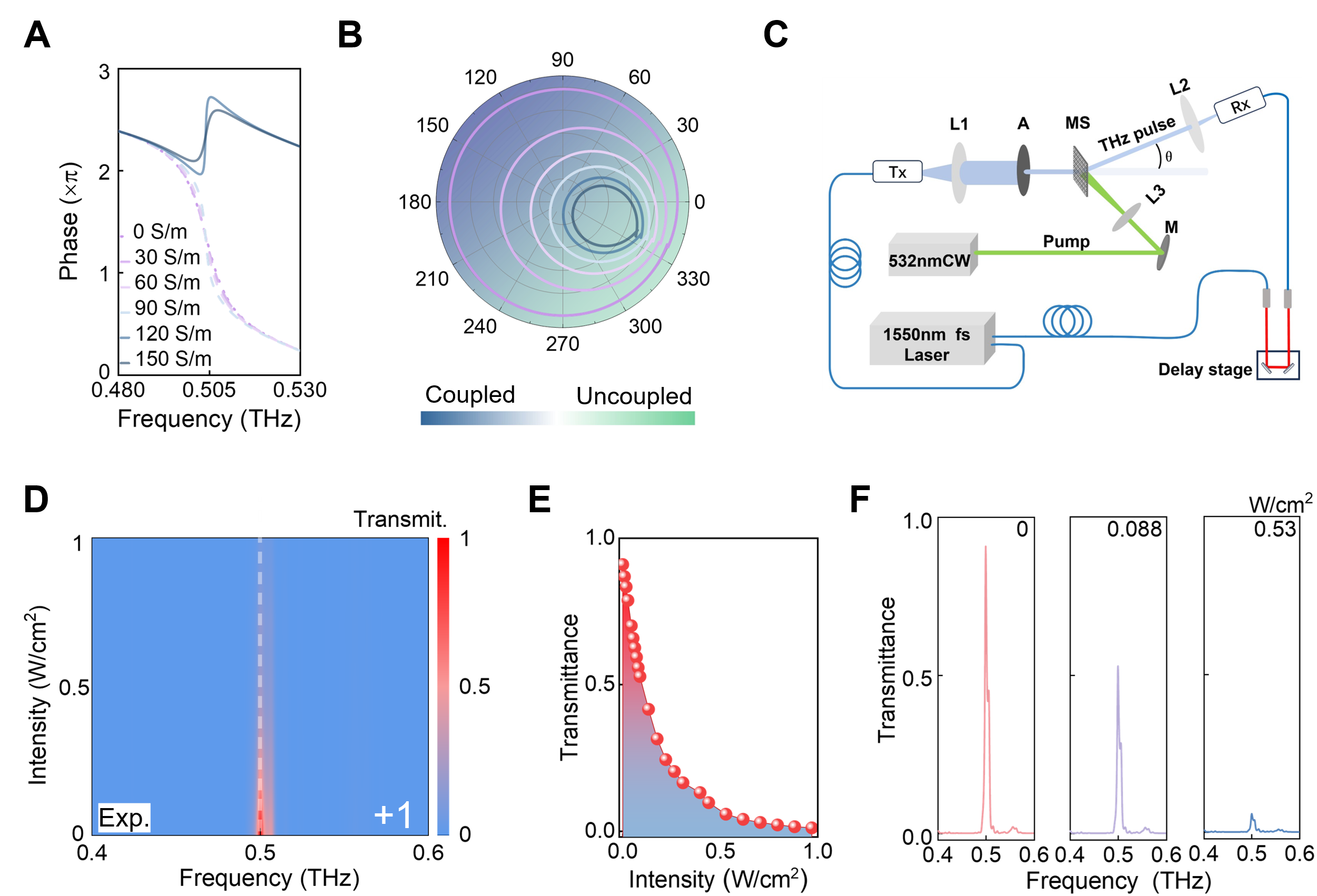 This study experimentally validates the low-threshold modulation capability of high-Q +1 order diffracted beams. The dual q-BIC degeneracy ensures complete 2π phase coverage under low-loss conditions, while loss inversion triggers distinct phase transitions that affect the preservation of the Kerker effect (Fig. 4A). Under continuous-wave optical pumping at merely 0.53 W/cm², the diffraction intensity drops from 92% to 5.8%, achieving a modulation depth as high as 94% (Fig. 4B-4F); substantially outperforming the less than 7% modulation observed in unpatterned silicon membranes. Experiments further demonstrate that this platform exhibits low-threshold characteristics under pulsed laser excitation, showcasing tremendous potential for leveraging BIC to enhance Q-factors, achieve narrower spectral selectivity, and reduce modulation energy consumption, thereby laying the foundation for next-generation high-speed, low-power terahertz control devices.