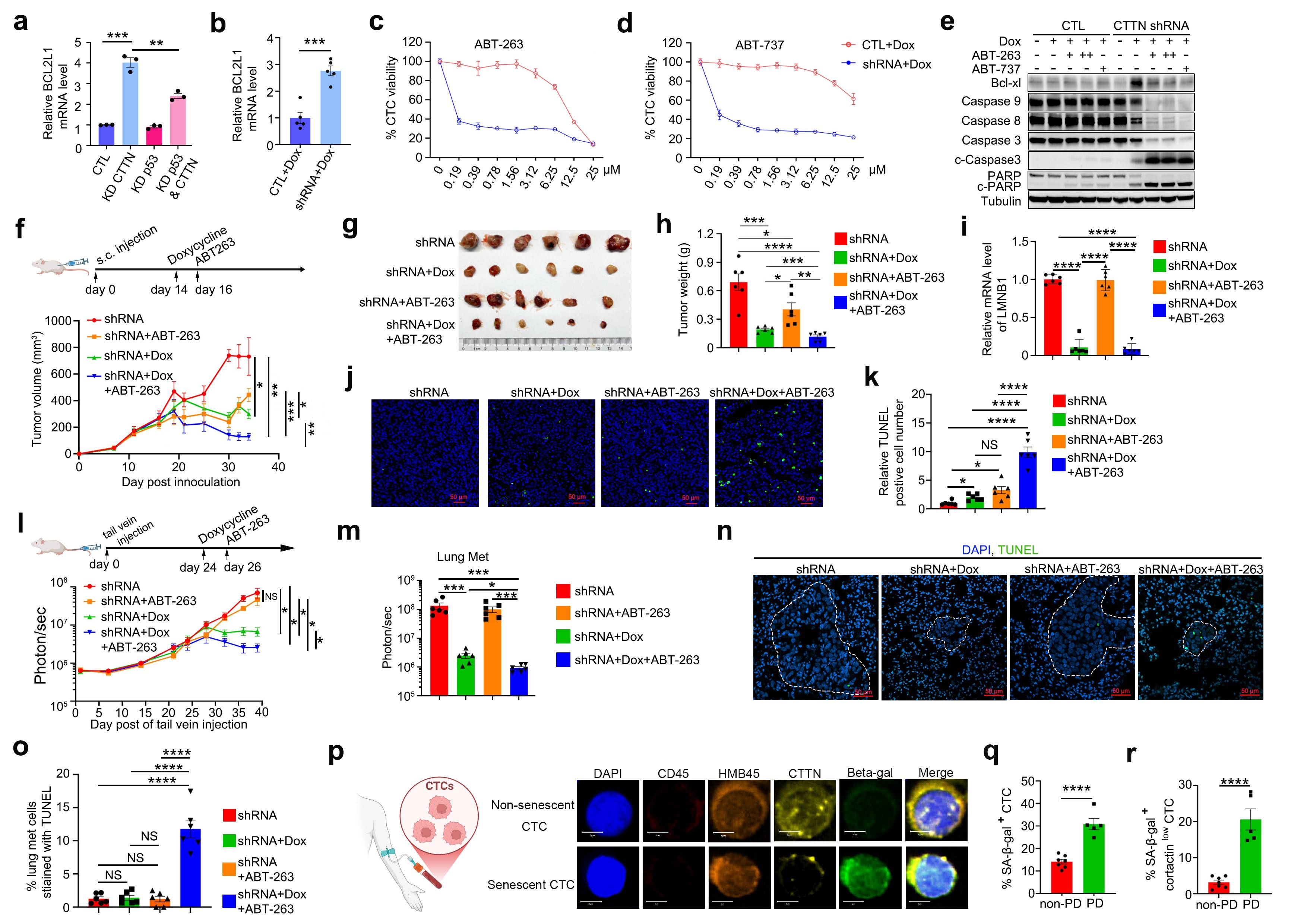 Cortactin knockdown-induced senescence in CTCs is characterized by a high expression of the BCL2L1 gene (encoding Bcl-xl), suggesting that these senescent cells may utilize the elevated expression of this gene to exert anti-apoptotic effects and maintain cell survival. Based on this observation, the research team devised a “one-two punch” sequential therapy: firstly, inducing senescence in CTCs by inhibiting Cortactin function, followed by selectively eliminating these senescent CTCs using the Bcl-xL inhibitor ABT-263 (acting as a senolytic drug). This strategy significantly reduced the number of CTCs and effectively inhibited hematogenous metastasis in animal models (Figure 3).