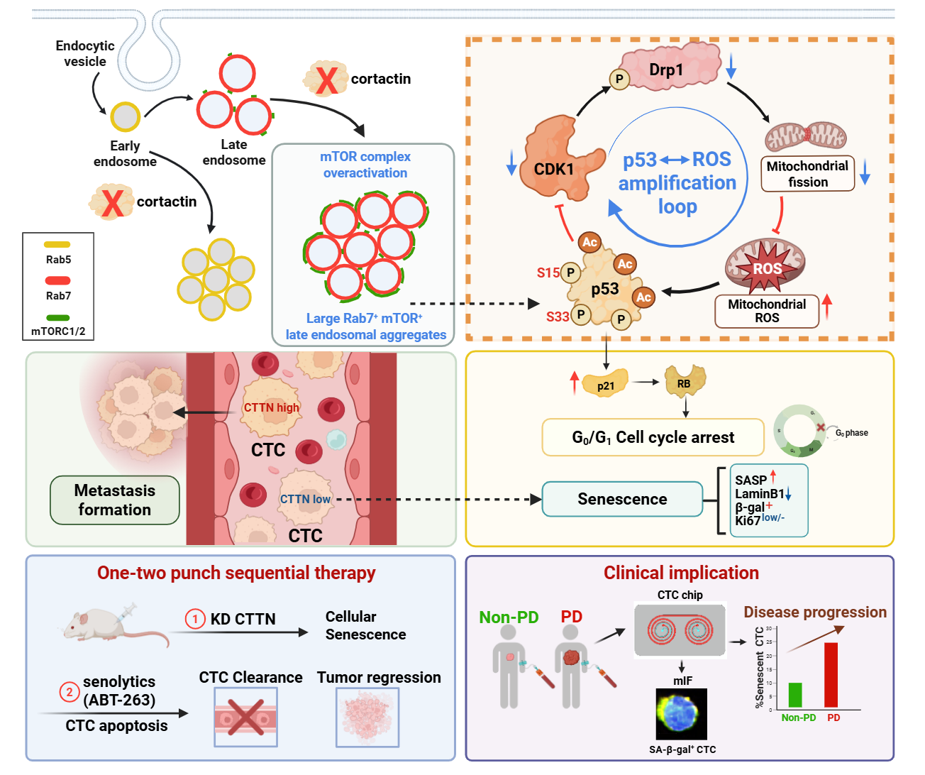 This study reveals for the first time that Cortactin—a cytoskeletal regulatory protein—enables melanoma circulating tumor cells (CTCs) to maintain late endosome homeostasis, thereby suppressing an mTOR/p53-dependent senescence program. This mechanism allows cancer cells to survive the highly stressful environment of the bloodstream and accomplish distant metastasis. Importantly, the research team proposed an innovative strategy, “senescence induction followed by senolytic therapy,” which significantly inhibits hematogenous metastasis.