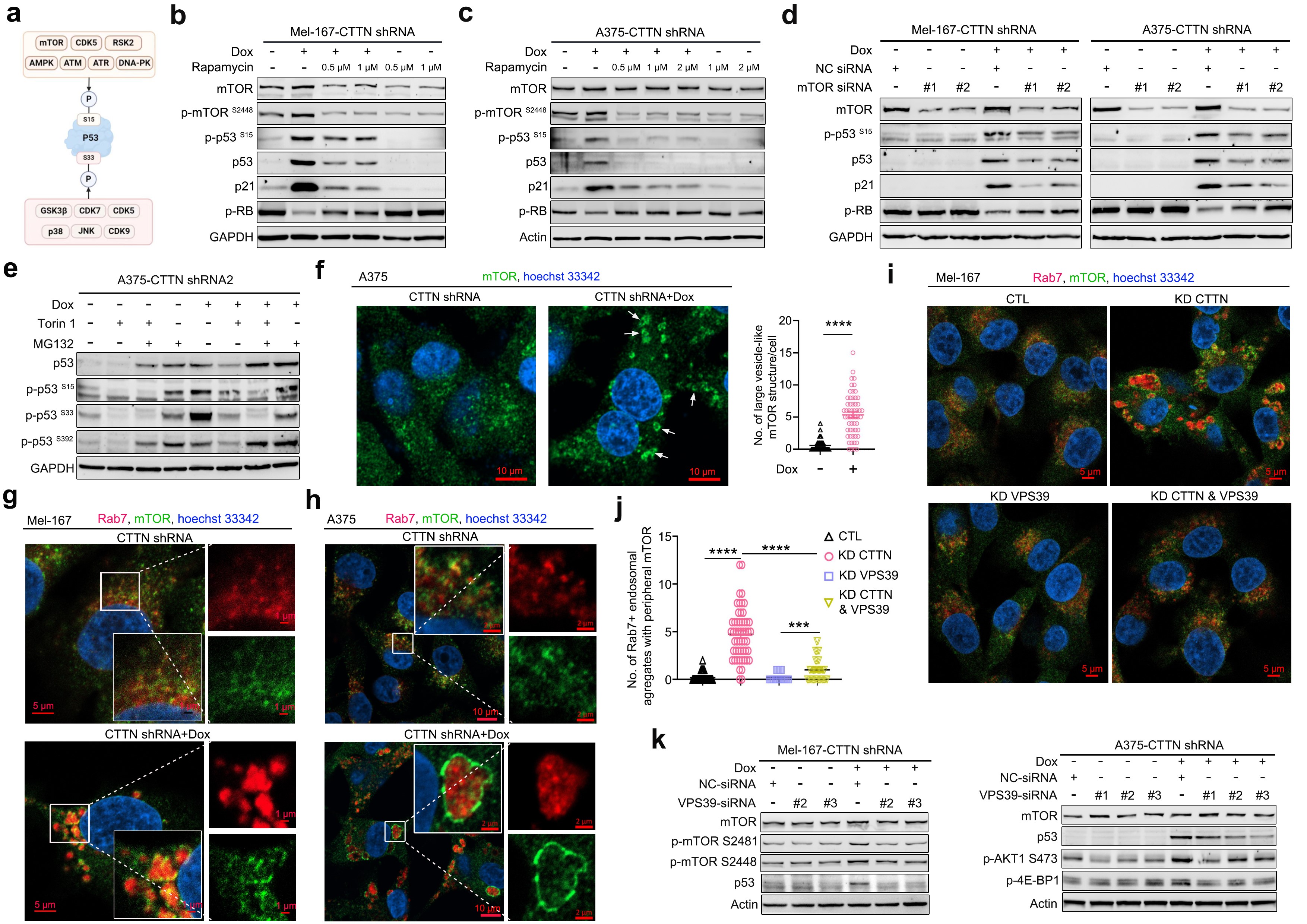 Figure 2. Cortactin knockdown leads to late endosome aggregation and activation of the mTOR/p53 signaling pathway.
