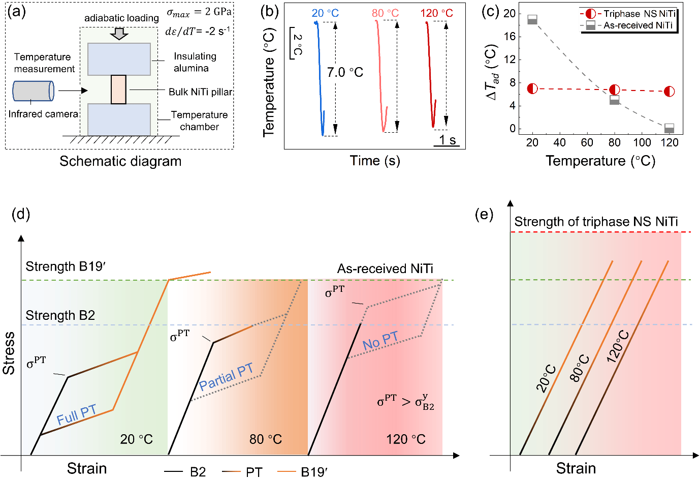 To address these key bottlenecks, the research team successfully prepared a three-phase nanostructured nickel-titanium alloy consisting of nanocrystalline martensite, nanocrystalline austenite, and an amorphous phase by precisely controlling the cold-rolling process parameters. Within a wide temperature range of 20-100 °C, the alloy’s stress-strain response and adiabatic temperature change show little variation with environmental temperature (Figure 1), demonstrating excellent mechanical stability, thermal stability, and shape-memory effect stability.