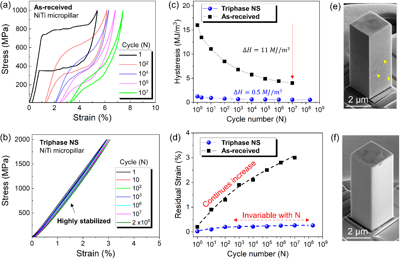 In addition to stable performance over a wide temperature range, this material also demonstrates outstanding long-term service reliability: across 200 million cyclic loading conditions, it showed almost no functional degradation or fatigue failure (Figure 2), confirming its ultra-long lifespan and high reliability even under extreme conditions. Researchers noted that this achievement provides a new approach for the design and regulation of a new generation of ultra-stable shape memory alloys, and it is expected to promote the engineering and large-scale application of elastocaloric refrigeration and solid-state heat pump technologies.