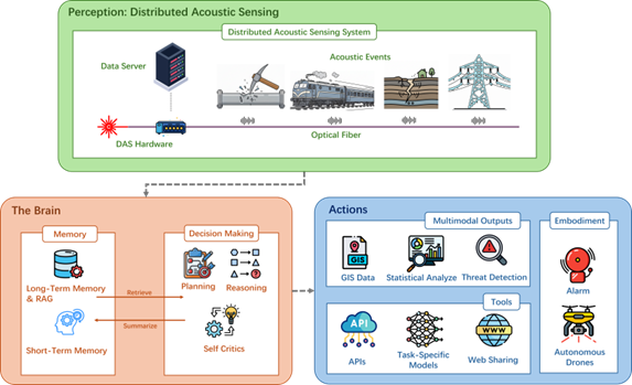 This paper proposes a collaborative architecture integrating a front-end DAS sensing unit and a back-end AI Agent decision-making hub, systematically constructing a closed-loop system of “Fiber Optic Sensing—Intelligent Decision-Making—Multi-Scenario Response.”