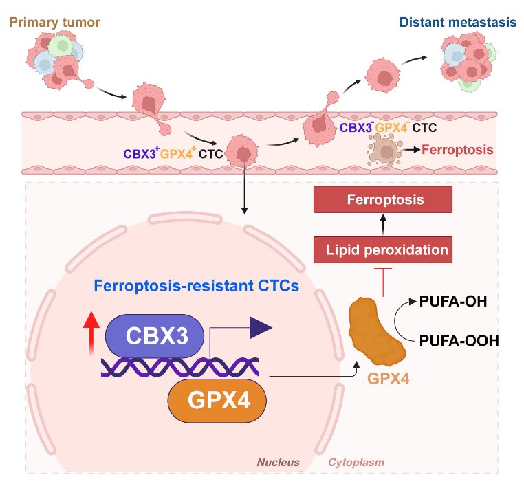 Collectively, these findings identify the CBX3-GPX4 axis as a pivotal driver of ferroptosis resistance in CTCs prone to brain metastasis. CBX3 promotes ferroptosis evasion to fuel CTC-mediated metastatic progression. Clinically, real-time monitoring of CBX3+GPX4+ CTCs may enable precise prediction of metastatic progression, underscoring their significant clinical potential as liquid biopsy biomarkers.