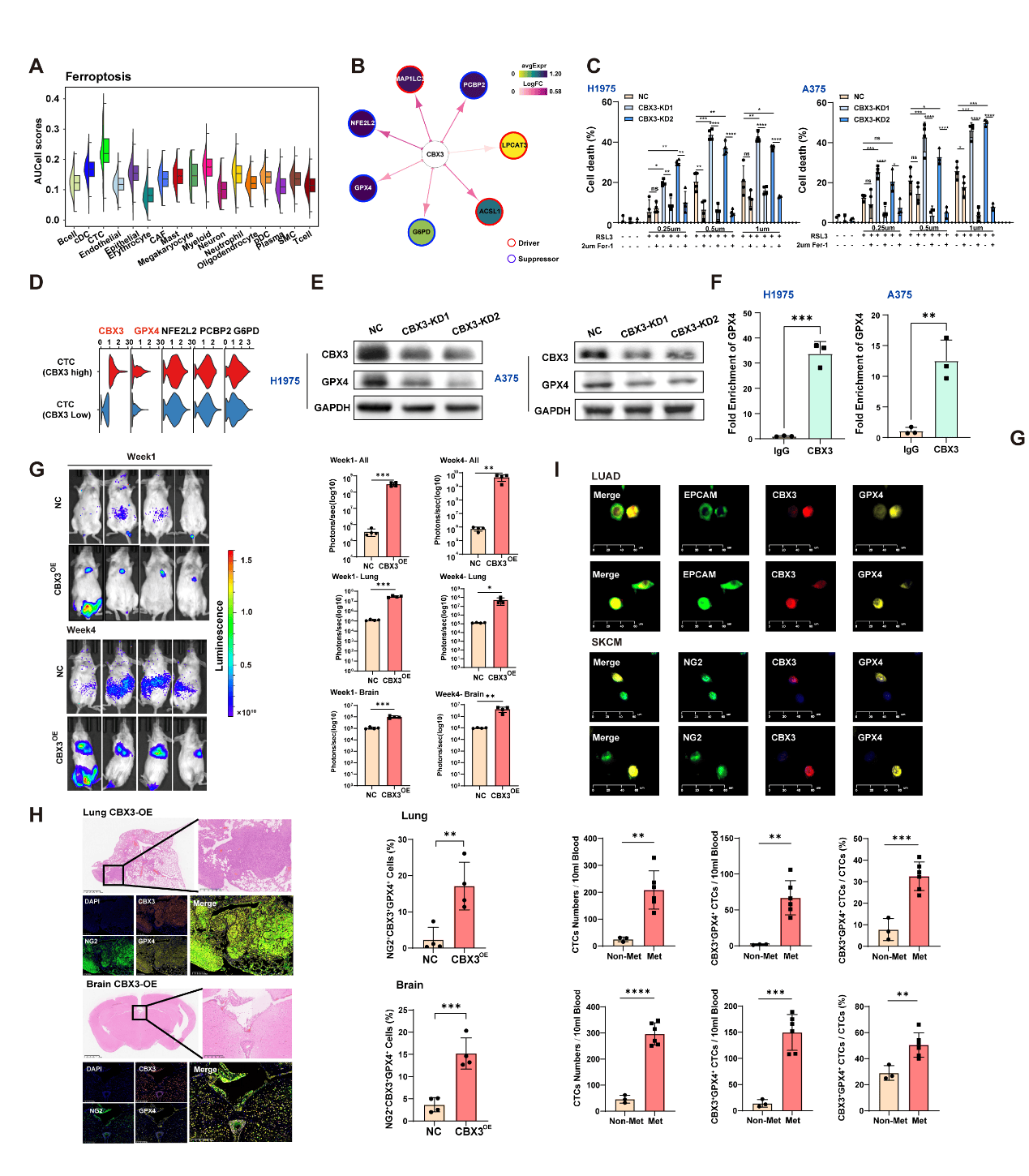 Mechanistically, CTCs predisposed to brain metastasis are characteristically in a ferroptosis-resistant state. These CTCs show significantly upregulated expression of the transcription factor CBX3, which is strongly correlated with the expression of the key anti-ferroptosis factor GPX4. Functionally, CBX3 protects CTCs from ferroptosis by regulating GPX4 expression. In H1975 lung cancer and A375 melanoma cell lines, CBX3 knockdown promotes ferroptosis and significantly reduces tumor cell survival and invasiveness. Conversely, CBX3 overexpression enhances anti-ferroptosis capability, growth, migration, and invasion in vitro, as well as metastasis in vivo (Fig. 2). In lung cancer and melanoma patient cohorts, both the counts of CBX3+GPX4+ CTCs and the proportion of CBX3+GPX4+ CTCs among total CTCs are significantly correlated with tumor metastasis, suggesting that CBX3+GPX4+ CTCs may represent potential non-invasive biomarkers (Fig. 2I).