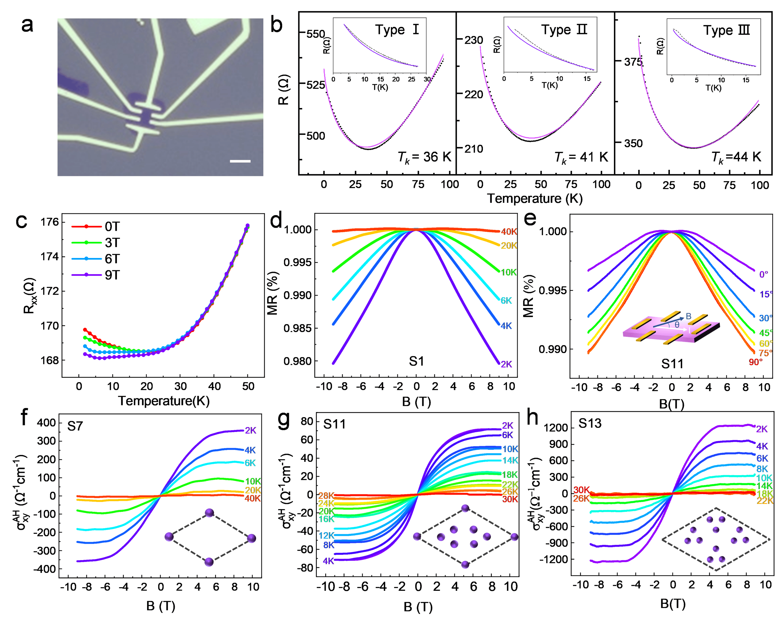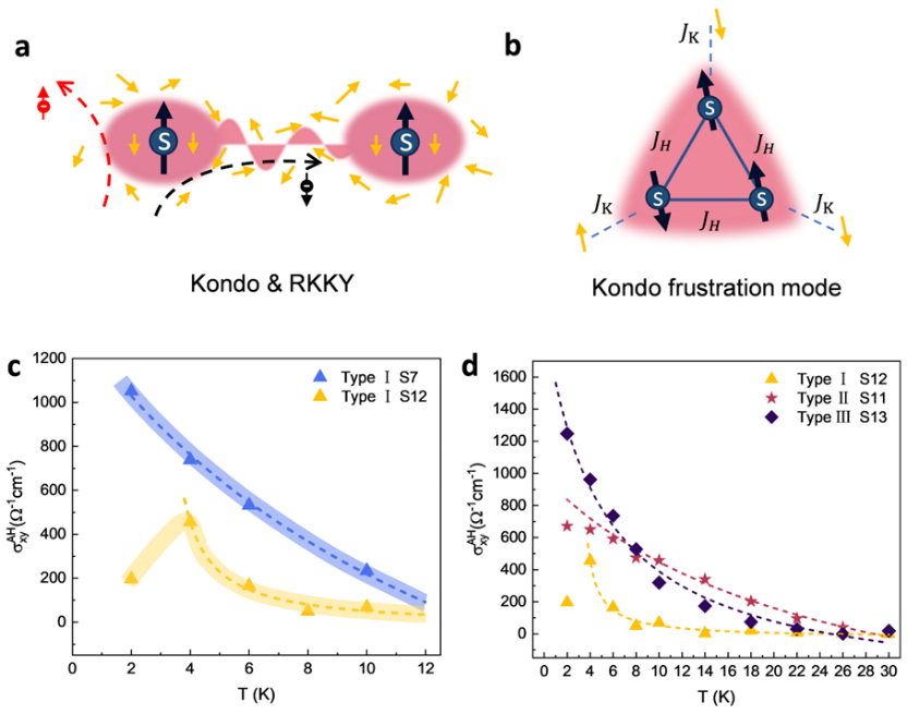 The team further used the anomalous Hall effect (AHE) to track the evolution of the Kondo system from the “single-impurity” regime to a “collective coherent” regime. Within the same Type I superlattice, changing the carrier concentration markedly alters the low-temperature AHE behavior: the low-carrier sample is more consistent with a Curie–Weiss-type single-impurity scattering picture, while the high-carrier sample displays signatures associated with coherent Kondo scattering at low temperature. Meanwhile, for Type II/III superlattices containing Ta trimers, the low-temperature AHE deviates from the single-impurity model, suggesting the emergence of collective effects and that interactions between local moments become non-negligible. Importantly, densely packed Ta trimers realize the structural unit required by the frustrated Kondo-triangle model and introduce a tunable short-range antiferromagnetic coupling, JH. Overall, the present results indicate that the samples remain primarily in the Kondo-singlet limit; reducing the carrier concentration to tune the ratio TK/JH is expected to drive the system into a more unconventional frustrated-Kondo regime, providing a clear route for exploring low-dimensional strongly correlated quantum states.