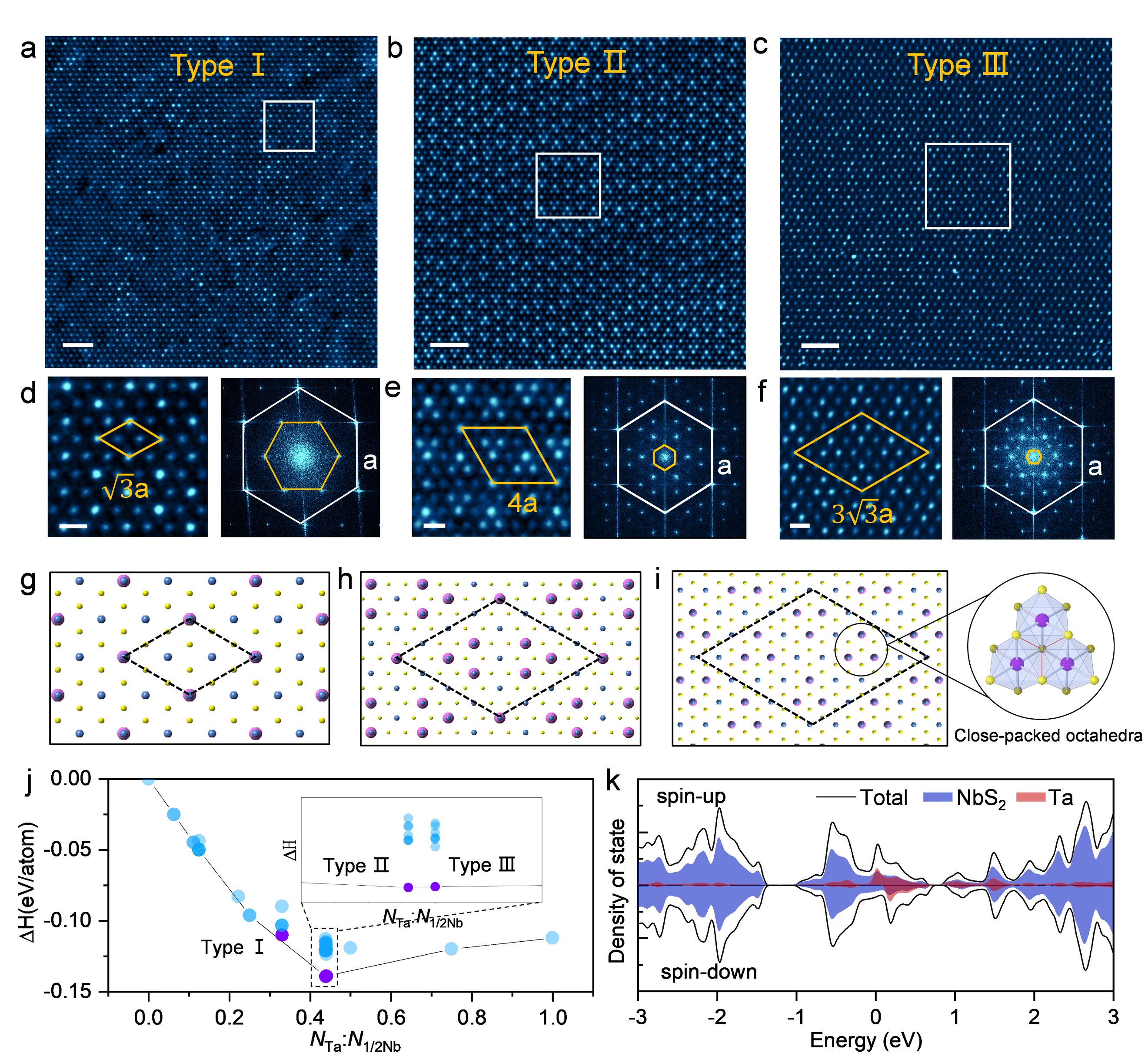 By precisely controlling the Ta intercalation concentration, the team experimentally realized three representative Ta sublattice configurations. Type I is a simple triangular intercalation lattice. Type II contains a coexistence of single Ta atoms and Ta trimers. Type III is a high-density trimer arrangement that can directly form the geometric building block for frustrated Kondo triangles, constituting a geometrically frustrated Kondo-triangle superlattice. Atomic-resolution HAADF-STEM imaging clearly resolved the atomic-scale ordering of these superlattice structures. Combined with first-principles calculations, the authors identified that intercalated Ta in an octahedral crystal field formed by six sulfur atoms hosts a stable local magnetic moment (corresponding to Ta⁴⁺ with spin S = 1/2), providing a key basis for realizing 2D Kondo physics. The calculations further indicate that different intercalation motifs lead to distinct magnetic interactions and energetic stability, offering guidance for experimental control.