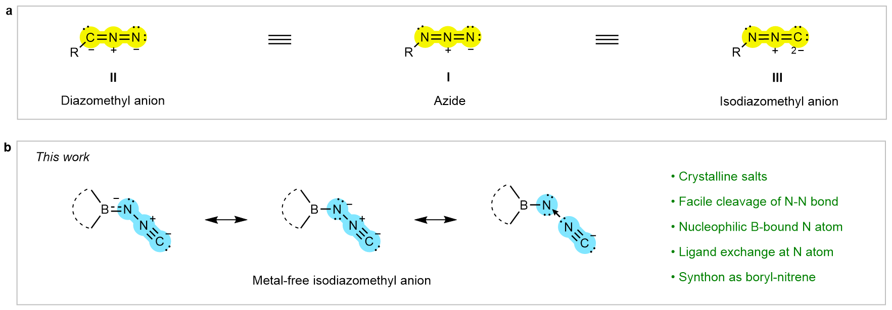 In sharp contrast, isodiazomethyl anions (Fig. 1a, [R–NNC]–, III) are exceedingly rare and have long posed a significant challenge in synthetic chemistry. Compared with II, isodiazomethyl anions exhibit substantially lower thermodynamic stability, rendering them inaccessible under ambient conditions. Although tautomerism between II and III was proposed in the early 20th century, only a few studies over the decades have reported in situ characterization of isodiazomethyl anions in solution, or accessed them through stabilization by transition-metal coordination. However, the isolation and structural authentication of a metal-free isodiazomethyl anion have not been reported to date, leaving its intrinsic electronic structure and reactivity essentially unexplored.