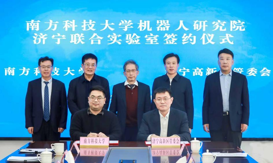 The Institute of Robotics at the Southern University of Science and Technology (SUSTech) and Jining City, Shandong Province, signed and jointly established the “SUSTech Institute of Robotics – Jining Joint Laboratory.” The unveiling ceremony was held in the High-tech Zone of Jining. Attending the event were Jiandong PANG, Standing Committee Member of the Jining Municipal Committee and Minister of the Organization Department; Jiansheng DAI, Fellow of the Royal Academy of Engineering, Fellow of the European Academy of Sciences and Arts, and Director of the SUSTech Institute of Robotics; and Yadong WANG, Secretary of the Party Working Committee and Director of the Administrative Committee of the Jining High-tech Zone, among others.