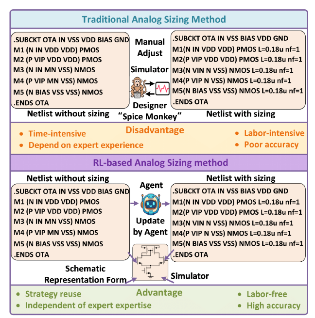 Figure 1: Traditional analog circuit sizing requires expert experience, while reinforcement learning can accelerate the sizing process