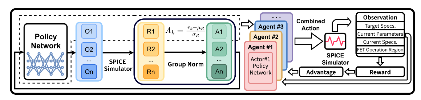 The SUSTech team proposed the FD-MAGRPO algorithm to address this challenge. The algorithm achieves two key technical innovations: First, it employs a critic-free network architecture that eliminates training instability caused by value estimation bias in traditional actor-critic reinforcement learning methods, making the algorithm more efficient and achieving faster convergence. Second, it introduces a functionality-driven grouping strategy that optimizes circuit components based on their functional roles rather than physical locations. This grouping approach allows components with similar behaviors to be controlled by the same agent, significantly improving coordination efficiency among multiple agents.
