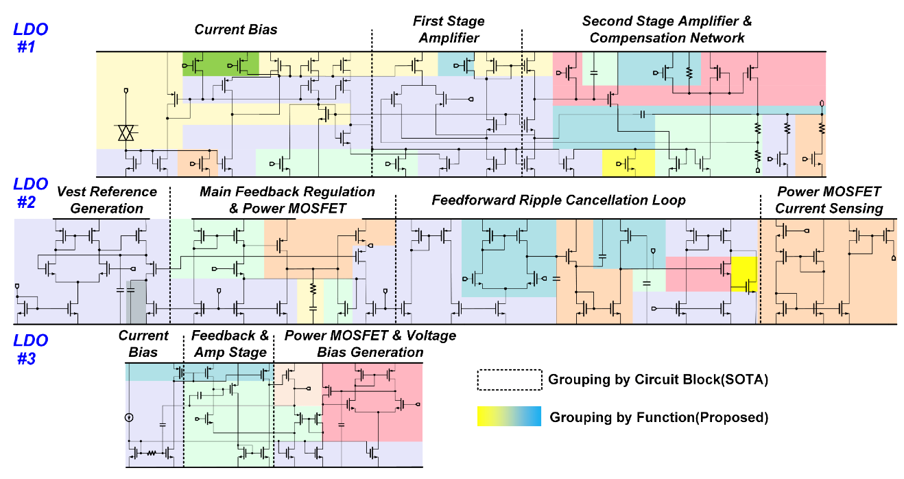 Figure 3: LDO circuit topologies used in experiments and the proposed function-based grouping method