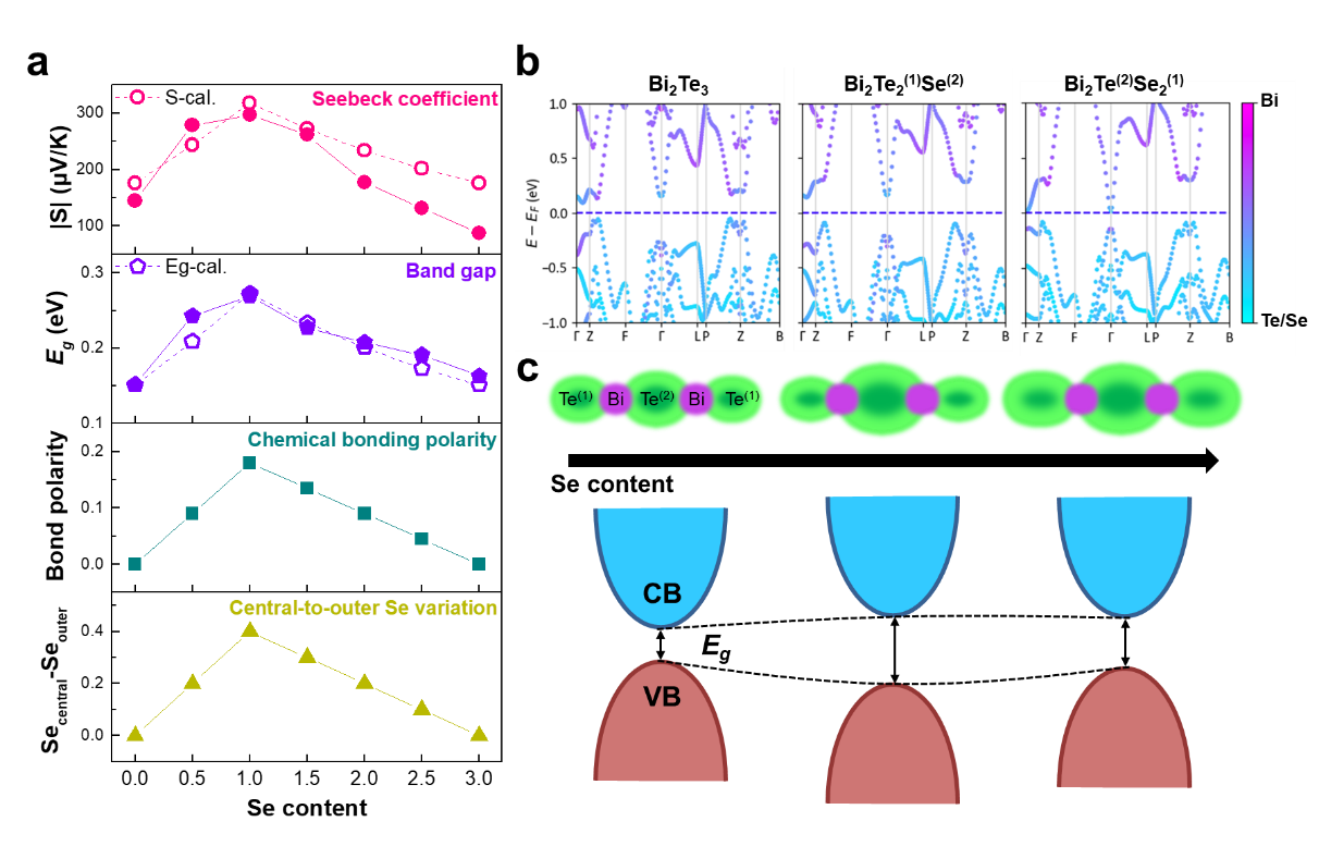 The study reveals that this atomic-scale chemical inhomogeneity directly governs thermoelectric properties. As the degree of Se enrichment in the central layer varies, the bonding polarity, band gap, and Seebeck coefficient evolve in a correlated manner (Fig. 3); larger differences in Se concentration between the central and outer layers lead to stronger bonding polarity, a wider band gap, and a higher Seebeck coefficient. Based on these relationships, the researchers established the first quantitative model linking atomic-scale site occupancy with macroscopic thermoelectric transport properties, enabling cross-scale prediction from electron microscopy observations to macroscopic transport parameters.