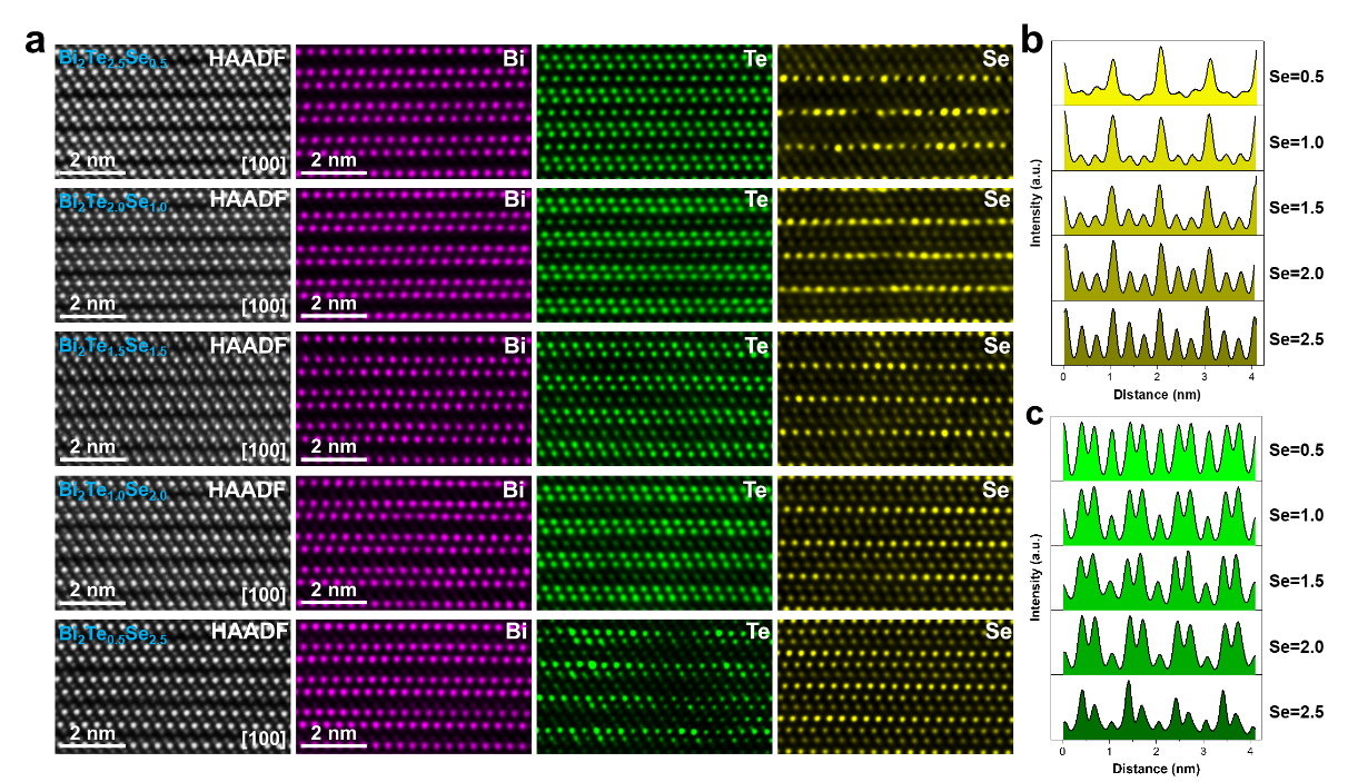 Bi2Te3-based materials are among the most efficient thermoelectric systems operating near room temperature and are widely used in micro-refrigeration and high-precision temperature control devices. Alloying with antimony (Sb) or selenium (Se) has long been an effective strategy for improving their performance. It has long been assumed that in the Bi2Te3-xSex solid solution, Se atoms first fully occupy the central Te(2) sites within the quintuple-layer structure before entering the outer Te(1) sites. However, using aberration-corrected scanning transmission electron microscopy combined with a newly developed data-denoising method, the SUSTech team directly revealed the atomic distribution of Se in the quintuple layers (Fig. 1). Their results show that Se atoms simultaneously occupy both Te(1) and Te(2) sites across all compositions, but consistently exhibit strong enrichment in the central layer, forming pronounced local chemical inhomogeneity. This behavior is observed throughout the entire composition range, indicating that it is an intrinsic structural characteristic of the Bi2Te3-xSex system rather than the uniform distribution assumed in ideal solid-solution models. Through atomic-scale compositional quantification, the researchers determined the exact Se occupancy at each layer and constructed an accurate atomic model incorporating this local inhomogeneity, revising previous structural models based solely on averaged crystallographic information.
