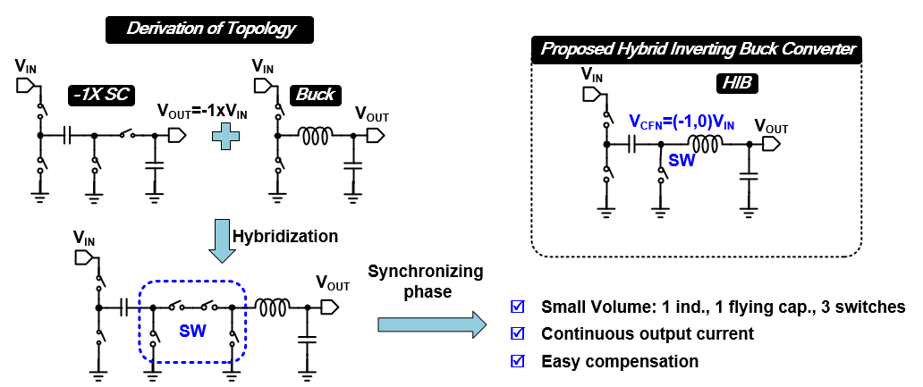 The research team proposed a hybrid inverting buck (HIB) converter that innovatively integrates a -1× switched-capacitor (SC) network with a buck converter. This topology requires only three power switches, one flying capacitor, and one inductor, achieving an adjustable negative output voltage from -1 to -2 V with a 3-to-4 V input (Figure 2). Compared to traditional inverting buck-boost (IBB) and Cuk converters, the design offers three key advantages: a smaller footprint where its power stage requires only two off-chip components; a continuous output current that enables faster load transient response; and the absence ofright-half-plane zeros (RHPZs) that simplifies loop compensation design.