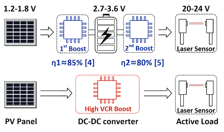 With the widespread adoption of Internet of Things (IoT) devices, high-efficiency power management systems have become crucial for extending device lifespan and reducing maintenance costs. Taking laser sensors powered by photovoltaic panels as an example, conventional solutions employing two-stage boost converter architectures typically exhibit system efficiencies below 70%, while suffering from large form factors and high costs.