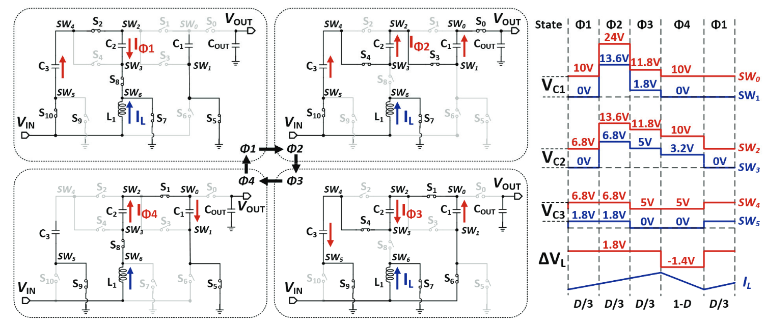 They illustrated the operating modes of the proposed converter topology, where three capacitors are switched to attain a 10× step-up gain—the maximum achievable ratio with three capacitors—while incorporating a switched-inductor technique to enable adjustable output voltage and reduce charge/discharge losses in switching capacitors (Figure 5). Compared to conventional boost converters, this topology reduces average inductor current by ~55% and inductor current ripple by 52%, significantly diminishing inductor size requirements.