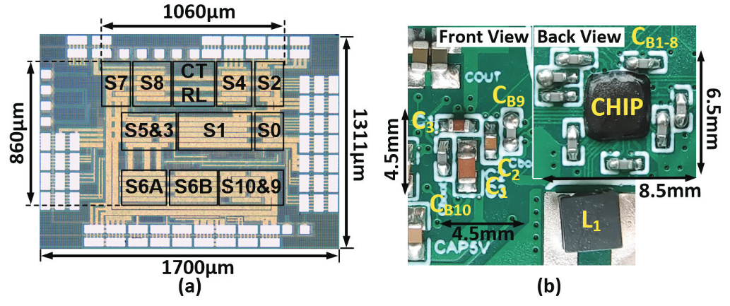 Fabricated and validated in a 0.18-μm process, the IC achieves a maximum output power of 6.87 W under a 3.7-5V input and 0-300 mA output current. It demonstrates 95% peak efficiency at 4.18 W output, an ultrafast 350 ns load transient response time from 0-200 mA, and a power density of 179 mW/mm³.