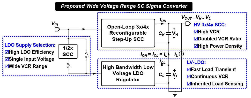 To address the critical limitation of fixed conversion ratios in switched-capacitor (SC) topologies—which narrows application scope—this work proposes a wide-output-range SC sigma converter architecture and chip design. The IC architecture combines a reconfigurable switched-capacitor network at the high-voltage output stage with a high-bandwidth LDO at the low-voltage input stage (Figure 7). The SC network switches its conversion ratio between 3× and 4× Vin, while the LDO’s input stage toggles between 1× and 0.5× Vin. This cascaded configuration achieves over 10× wider output voltage range compared to fixed-ratio SC converters reported at ISSCC 2024, while the LDO simultaneously delivers rapid, high-precision dynamic voltage regulation.