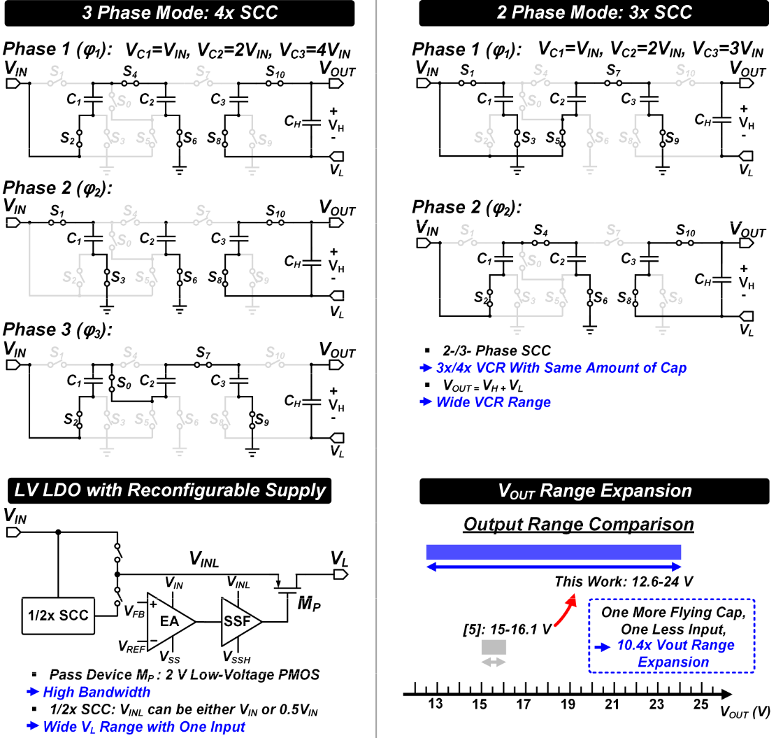 When the SC network operates in 3-phase mode, it achieves a 4× step-up gain; in 2-phase operation, it delivers a 3× voltage boost (Figure 8). Combined with the LDO’s continuously variable voltage regulation capability, the converter achieves a 12.6-24 V output range—10.4× wider than the sigma switched-capacitor (SC) boost converter presented at ISSCC 2024.