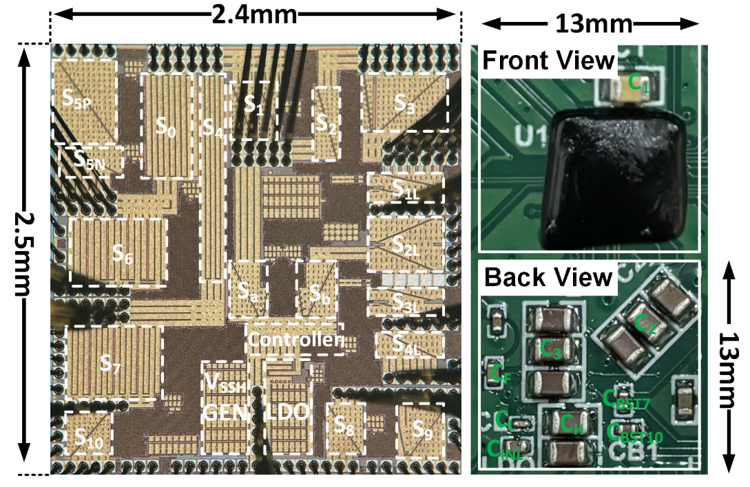 Fabricated in a 0.18-μm process, the IC occupies just 2.23-mm². Operating with a 1.2-to-1.8V input, it achieves a 20-to-24V output with an 11-to-20× voltage conversion ratio, attaining 76.7% peak efficiency and 12-mW/mm³ power density.