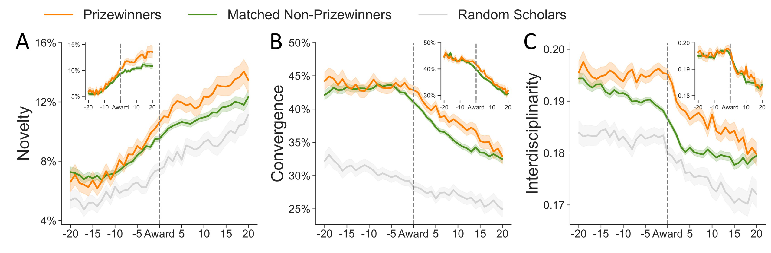 Further analysis shows that this innovation advantage typically emerges years before the award is received. Approximately five years prior to receiving recognition, prizewinners already display markedly higher novelty and interdisciplinarity compared with their non-awarded peers—and these advantages remain robust even after the award. This suggests that scientific prizes primarily recognize long-term innovative performance, rather than merely stimulating it through post-award incentives.