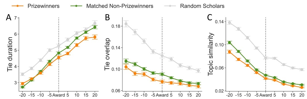 Figure 3. Dynamic evolution of collaborative network structures among prizewinners vs. matched non-prizewinners