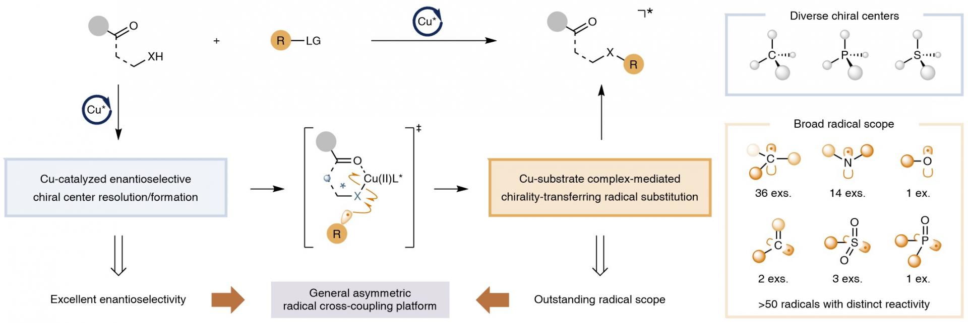 In this study, the researchers report the development of a highly versatile and general catalytic asymmetric radical cross-coupling of γ-aminocarbonyl alcohols, β-aminocarbonyl H-phosphinates, and N-acyl sulfenamides with a diverse array of electrophiles (Figure 1). This method accommodates over 50 different C-, N-, O-, S-, and P-centered radicals—including highly reactive methyl, tert-butoxyl and phenyl radicals—enabling access to a wide variety of enantioenriched C-, P- and S-chiral compounds.